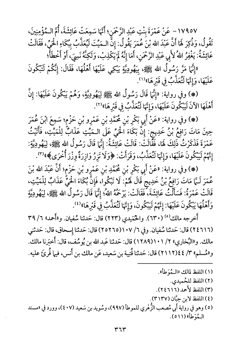١٧٩٥٧ - عن عَمرَة بنت عبد الرَّحمَن؛ أنها سمعت عائشة، أُم المؤمنين، تقول، وذكر لها أن عبد الله بن عمر يقول: إن الميت ليعذب ببكاء الحي، فقالت عائشة: يغفر الله لأبي عبد الرَّحمَن، أما إنه لم يكذب، ولكنه نسي، أو أخطأ؛
