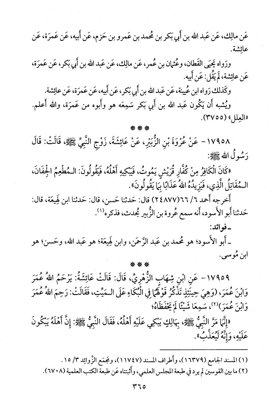 ١٧٩٥٨ - عن عروة بن الزبير، عن عائشة، زوج النبي صَلى الله عَليه وسَلم قالت: قال رسول الله صَلى الله عَليه وسَلم: