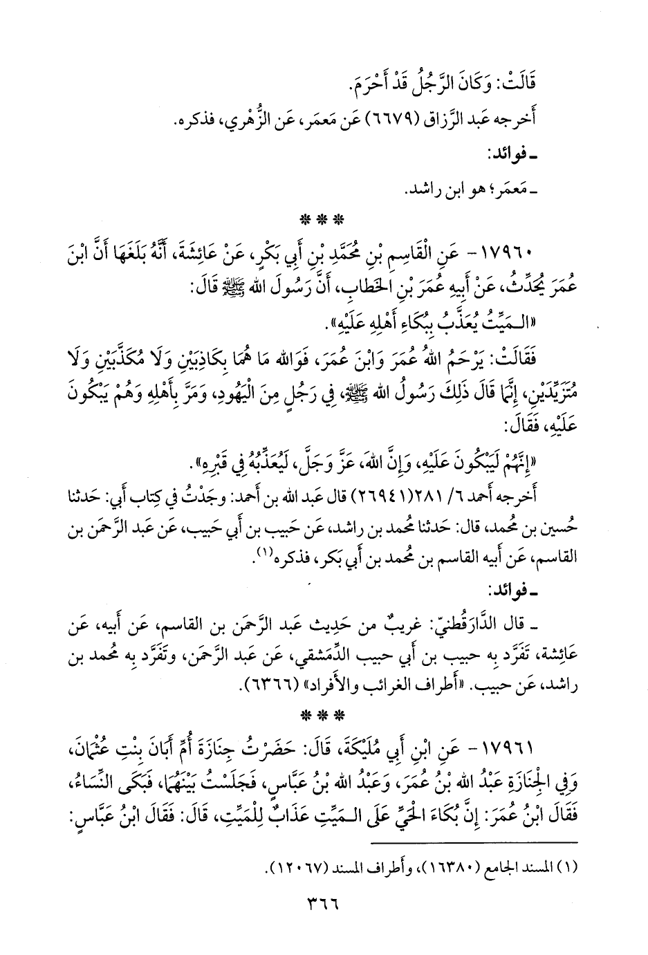 ١٧٩٦٠ - عن القاسم بن محمد بن أَبي بكر، عن عائشة، أنه بلغها أن ابن عمر يحدث، عن أبيه عمر بن الخطاب، أن رسول الله صَلى الله عَليه وسَلم قال: