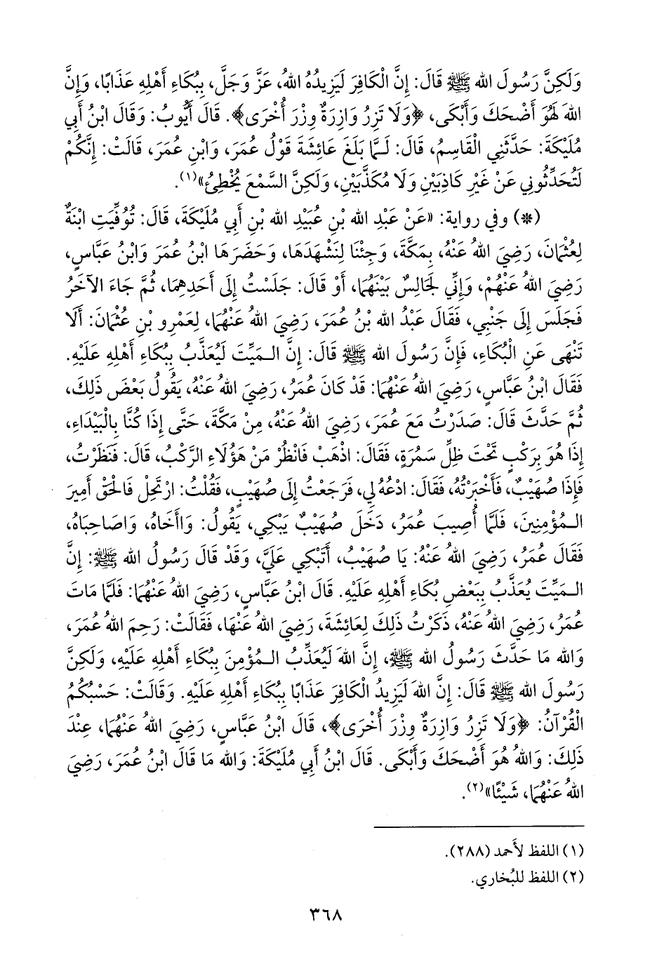 - وفي رواية: «عن عبد الله بن عُبيد الله بن أَبي مُليكة، قال: توفيت ابنة لعثمان، رضي الله عنه، بمكة، وجئنا لنشهدها، وحضرها ابن عمر وابن عباس، رضي الله عنهم، وإني لجالس بينهما، أو قال: جلست إلى أحدهما، ثم جاء الآخر فجلس إلى جنبي، فقال عبد الله بن عمر، رضي الله عنهما، لعَمرو بن عثمان: ألا تنهى عن البكاء، فإن رسول الله صَلى الله عَليه وسَلم قال: إن الميت ليعذب ببكاء أهله عليه. فقال ابن عباس، رضي الله عنهما: قد كان عمر، رضي الله عنه، يقول بعض ذلك، ثم حدث قال: صدرت مع عمر، رضي الله عنه، من مكة، حتى إذا كنا بالبيداء، إذا هو بركب تحت ظل سمرة، فقال: اذهب فانظر من هؤلاء الركب، قال: فنظرت، فإذا صهيب، فأخبرته، فقال: ادعه لي، فرجعت إلى صهيب، فقلت: ارتحل فالحق أمير المؤمنين، فلما أصيب عمر، دخل صهيب يبكي، يقول: واأخاه، واصاحباه، فقال عمر، رضي الله عنه: يا صهيب، أتبكي علي، وقد قال رسول الله صَلى الله عَليه وسَلم: إن الميت يعذب ببعض بكاء أهله عليه. قال ابن عباس، رضي الله عنهما: فلما مات عمر، رضي الله عنه، ذكرت ذلك لعائشة، رضي الله عنها، فقالت: رحم الله عمر، والله ما حدث رسول الله صَلى الله عَليه وسَلم إن الله ليعذب المؤمن ببكاء أهله عليه، ولكن رسول الله صَلى الله عَليه وسَلم قال: إن الله ليزيد الكافر عذابا ببكاء أهله عليه. وقالت: حسبكم القرآن: {ولا تزر وازرة وزر أخرى}، قال ابن عباس، رضي الله عنهما، عند ذلك: والله هو أضحك وأبكى. قال ابن أَبي مُليكة: والله ما قال ابن عمر، رضي الله عنهما، شيئا» (¬٢).