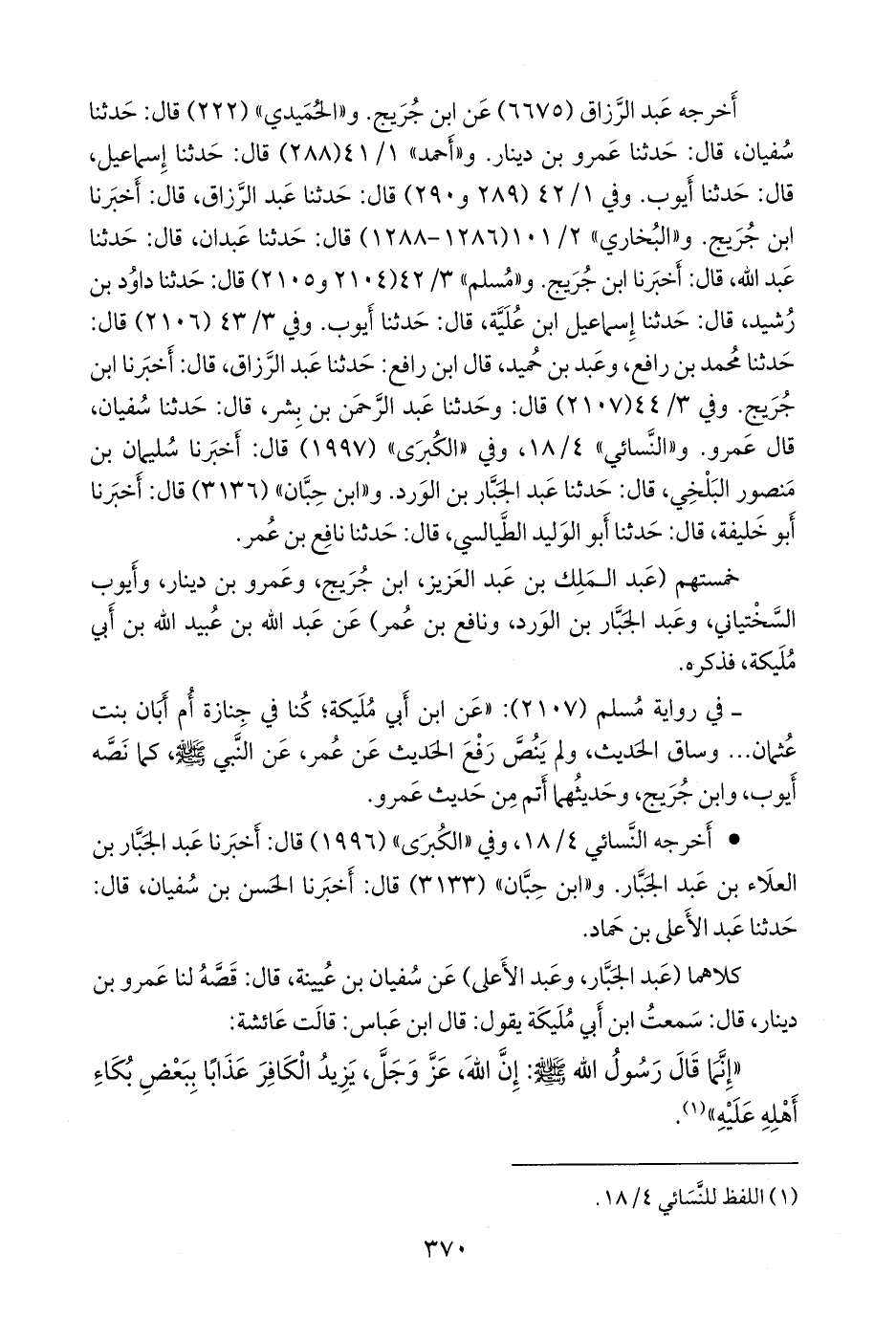 - في رواية مسلم (٢١٠٧): «عن ابن أَبي مُليكة؛ كنا في جِنازة أم أبان بنت عثمان ... وساق الحديث، ولم ينص رفع الحديث عن عمر، عن النبي صَلى الله عَليه وسَلم كما نصه أيوب، وابن جُريج، وحديثهما أتم من حديث عَمرو.