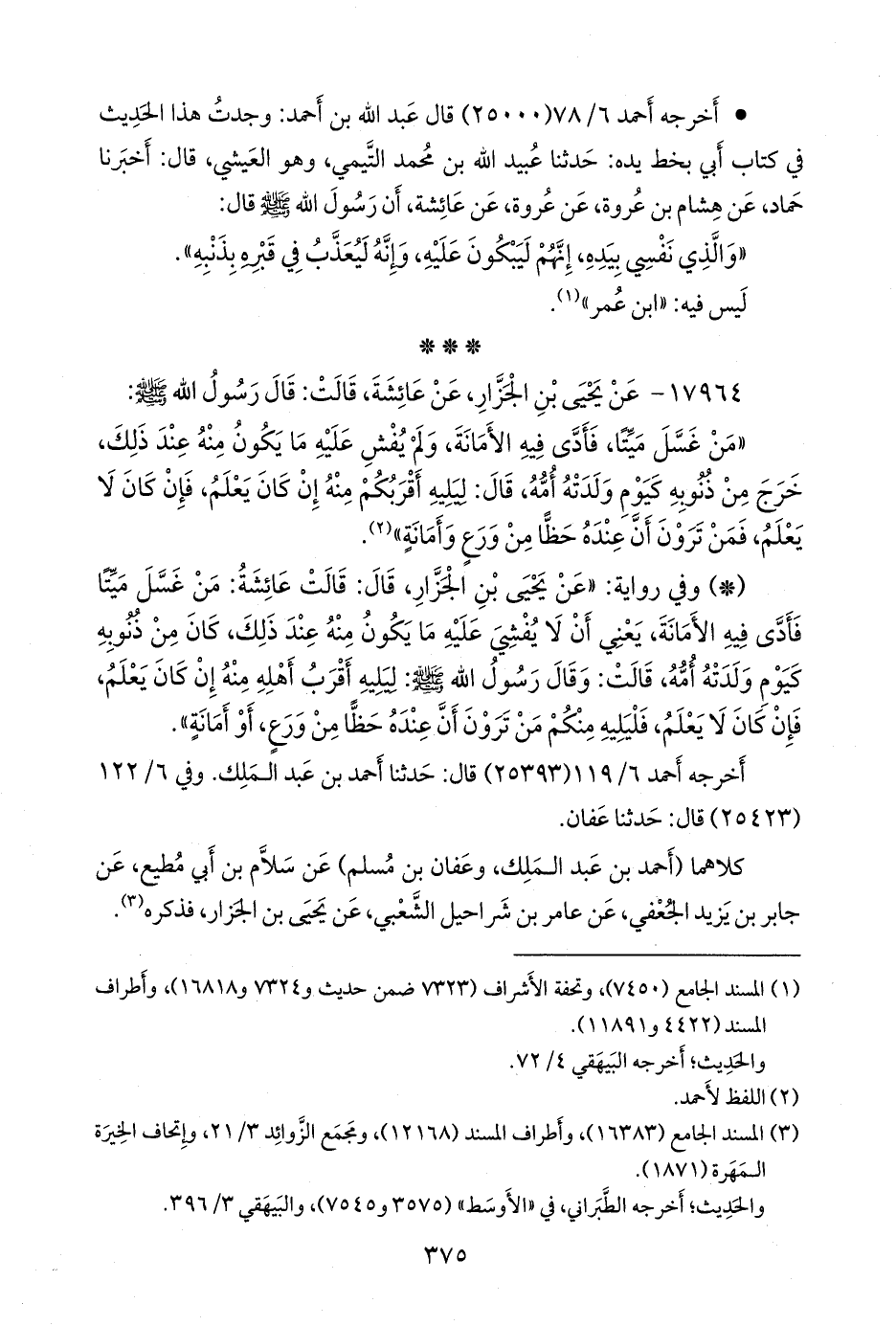 - وفي رواية: «عن يحيى بن الجزار، قال: قالت عائشة: من غسل ميتا فأدى فيه الأمانة، يعني أن لا يفشي عليه ما يكون منه عند ذلك، كان من ذنوبه كيوم ولدته أمه، قالت: وقال رسول الله صَلى الله عَليه وسَلم: ليليه أقرب أهله منه إن كان يعلم، فإن كان لا يعلم، فليليه منكم من ترون أن عنده حظا من ورع، أو أمانة».