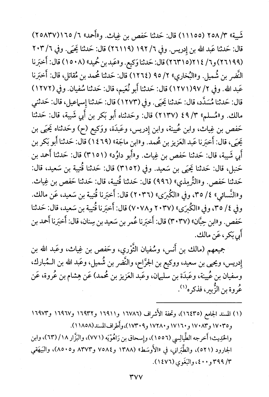 جميعهم (مالك بن أنس، وسفيان الثوري، وحفص بن غياث، وعبد الله بن إدريس، ويحيى بن سعيد، ووكيع بن الجراح، والنضر بن شميل، وعبد الله بن المبارك، وسفيان بن عُيينة، وعَبدة بن سليمان، وعبد العزيز بن محمد) عن هشام بن عروة، عن عروة بن الزبير، فذكره (¬١).