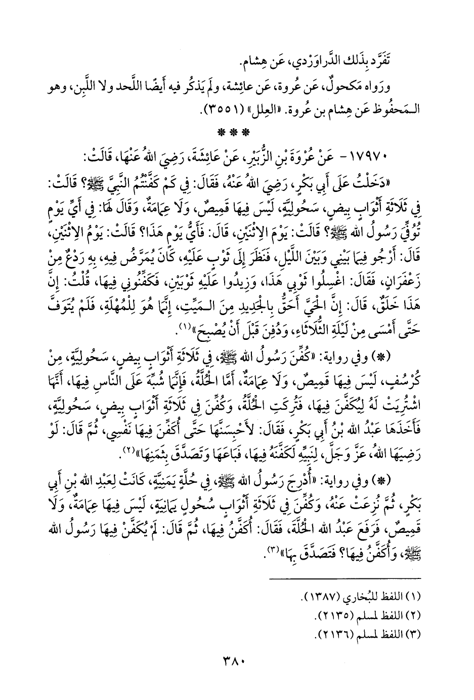 - وفي رواية: «كفن رسول الله صَلى الله عَليه وسَلم في ثلاثة أثواب بيض، سحولية، من كرسف، ليس فيها قميص، ولا عمامة، أما الحلة، فإنما شبه على الناس فيها، أنها اشتريت له ليكفن فيها، فتركت الحلة، وكفن في ثلاثة أثواب بيض، سحولية، فأخذها عبد الله بن أَبي بكر، فقال: لأحبسنها حتى أكفن فيها نفسي، ثم قال: لو رضيها الله، عز وجل، لنبيه لكفنه فيها، فباعها وتصدق بثمنها» (¬٢).