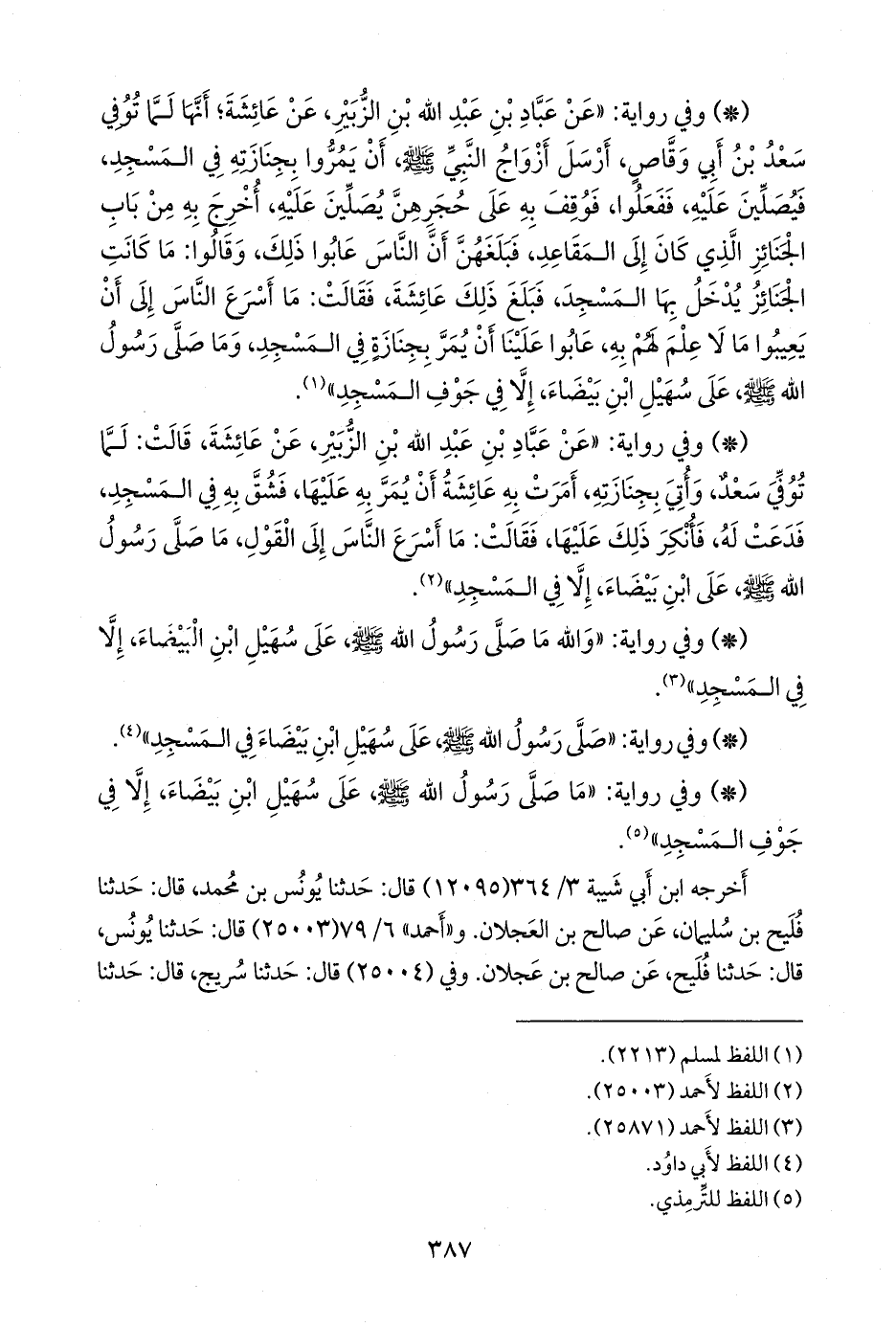 - وفي رواية: «والله ما صلى رسول الله صَلى الله عَليه وسَلم على سهيل ابن البيضاء، إلا في المسجد» (¬١).