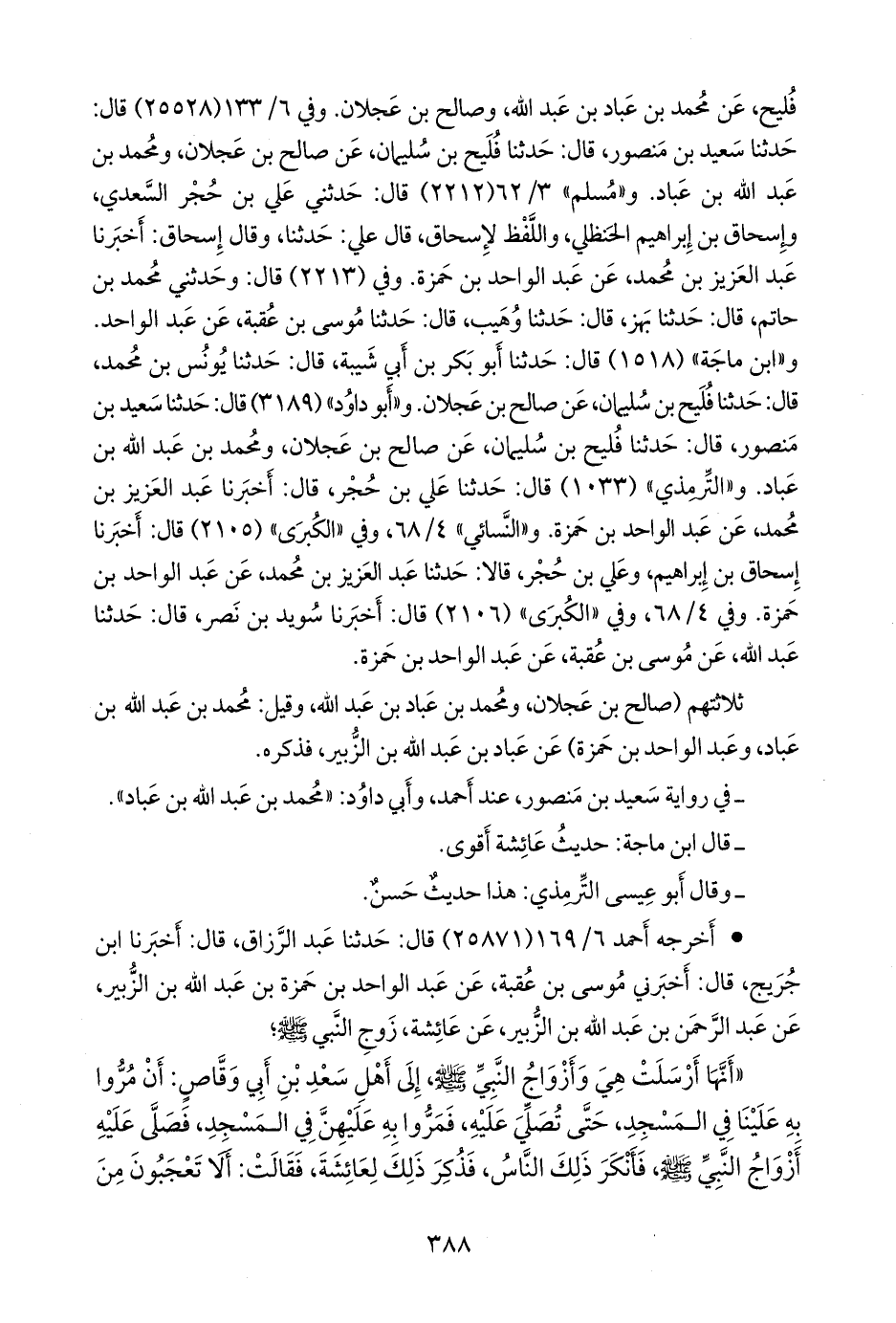 وفي (٢٢١٣) قال: وحدثني محمد بن حاتم, قال: حدثنا بَهز, قال: حدثنا وهيب, قال: حدثنا موسى بن عُقبة، عن عبد الواحد. و «ابن ماجة» (١٥١٨) قال: حدثنا أَبو بكر بن أبي شيبة, قال: حدثنا يونس بن محمد, قال: حدثنا فليح بن سليمان، عن صالح بن عَجلان. و «أَبو داود» (٣١٨٩) قال: حدثنا سعيد بن منصور, قال: حدثنا فليح بن سليمان، عن صالح بن عَجلان، ومحمد بن عبد الله بن عباد. و «التِّرمِذي» (١٠٣٣) قال: حدثنا علي بن حُجْر، قال: أخبرنا عبد العزيز بن محمد، عن عبد الواحد بن حمزة. و «النَّسَائي» ٤/ ٦٨، وفي «الكبرى» (٢١٠٥) قال: أخبرنا إسحاق بن إبراهيم، وعلي بن حُجْر، قالا: حدثنا عبد العزيز بن محمد، عن عبد الواحد بن حمزة. وفي ٤/ ٦٨، وفي «الكبرى» (٢١٠٦) قال: أخبرنا سويد بن نصر، قال: حدثنا عبد الله، عن موسى بن عُقبة، عن عبد الواحد بن حمزة.