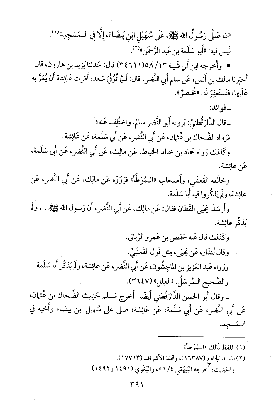 - وقال أَبو الحسن الدارقُطني أيضا: أخرج مسلم حديث الضحاك بن عثمان، عن أبي النضر، عن أبي سلمة، عن عائشة؛ صلى على سهيل ابن بيضاء وأخيه في المسجد.