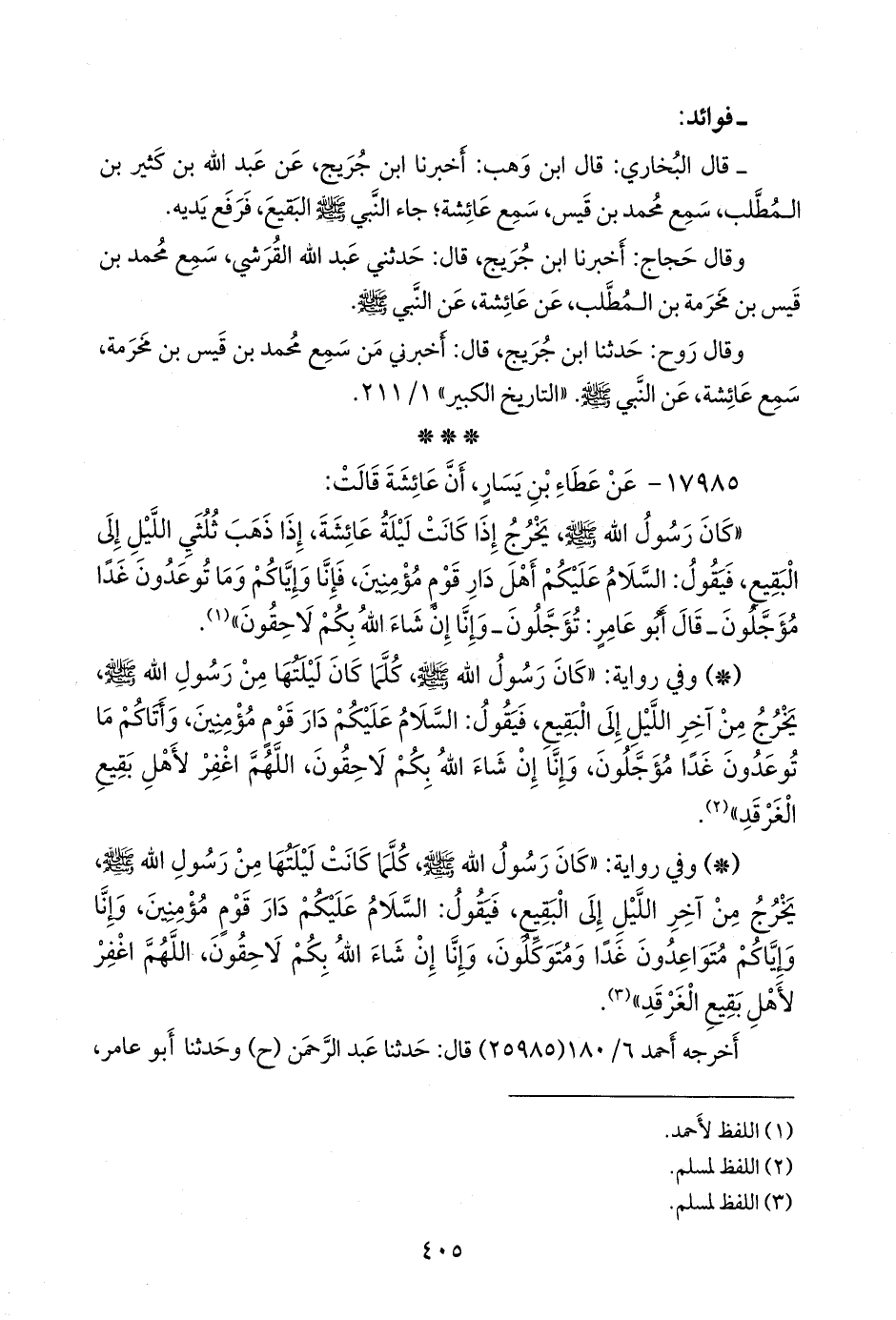 - قال البخاري: قال ابن وهب: أخبرنا ابن جُريج، عن عبد الله بن كثير بن المطلب، سمع محمد بن قيس، سمع عائشة؛ جاء النبي صَلى الله عَليه وسَلم البقيع، فرفع يديه.