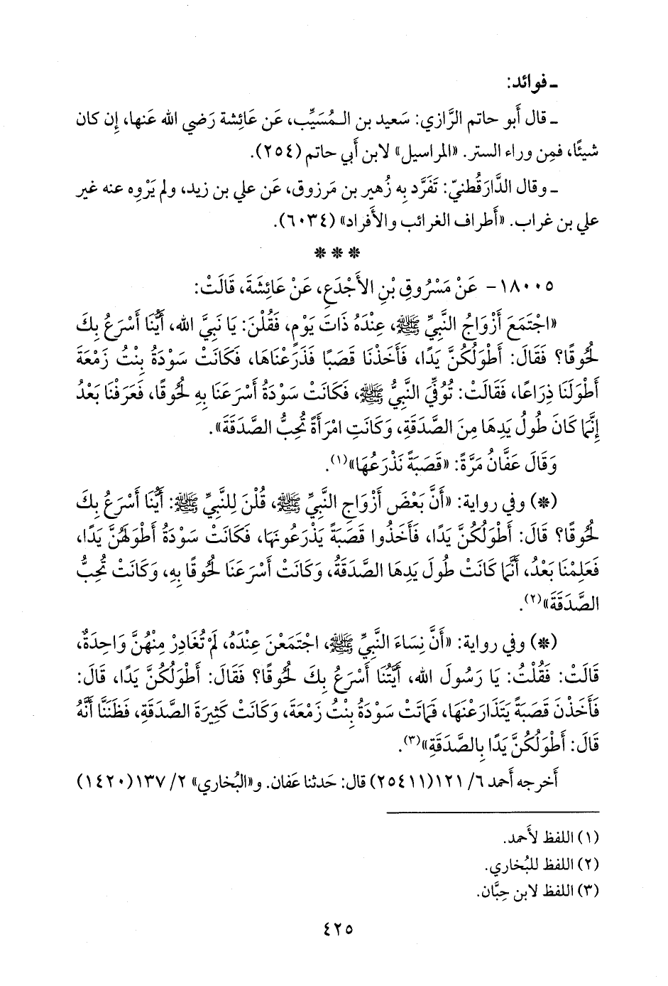 - وفي رواية: «أن نساء النبي صَلى الله عَليه وسَلم اجتمعن عنده، لم تغادر منهن واحدة، قالت: فقلت: يا رسول الله، أيتنا أسرع بك لحوقا؟ فقال: أطولكن يدا، قال: فأخذن قصبة يتذارعنها، فماتت سودة بنت زمعة، وكانت كثيرة الصدقة، فظننا أنه قال: أطولكن يدا بالصدقة» (¬١).
