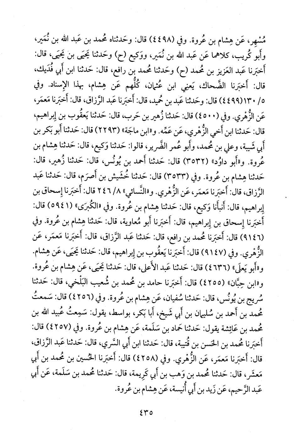 وفي (٩١٤٦) قال: أخبرنا محمد بن رافع، قال: حدثنا عبد الرزاق، قال: أخبرنا مَعمَر، عن الزُّهْري. وفي (٩١٤٧) قال: أخبرنا يعقوب بن إبراهيم، قال: حدثنا يحيى، عن هشام. و «أَبو يَعلى» (٤٦٣٦) قال: حدثنا عبد الأعلى، قال: حدثنا يحيى، عن هشام بن عروة. و «ابن حِبَّان» (٤٢٥٥) قال: أخبرنا حامد بن محمد بن شعيب البلخي، قال: حدثنا سريج بن يونس، قال: حدثنا سفيان، عن هشام بن عروة. وفي (٤٢٥٦) قال: سمعت محمد بن أحمد بن سليمان بن أبي شيخ، أبا بكر، بواسط، يقول: سمعت عُبيد الله بن محمد بن عائشة يقول: حدثنا حماد بن سلمة، عن هشام بن عروة. وفي (٤٢٥٧) قال: أخبرنا محمد بن الحسن بن قتيبة، قال: حدثنا ابن أبي السري، قال: حدثنا عبد الرزاق، قال: أخبرنا مَعمَر، عن الزُّهْري. وفي (٤٢٥٨) قال: أخبرنا الحسين بن محمد بن أبي معشر، قال: حدثنا محمد بن وهب بن أبي كريمة، قال: حدثنا محمد بن سلمة، عن أبي عبد الرحيم، عن زيد بن أَبي أُنيسة، عن هشام بن عروة.
