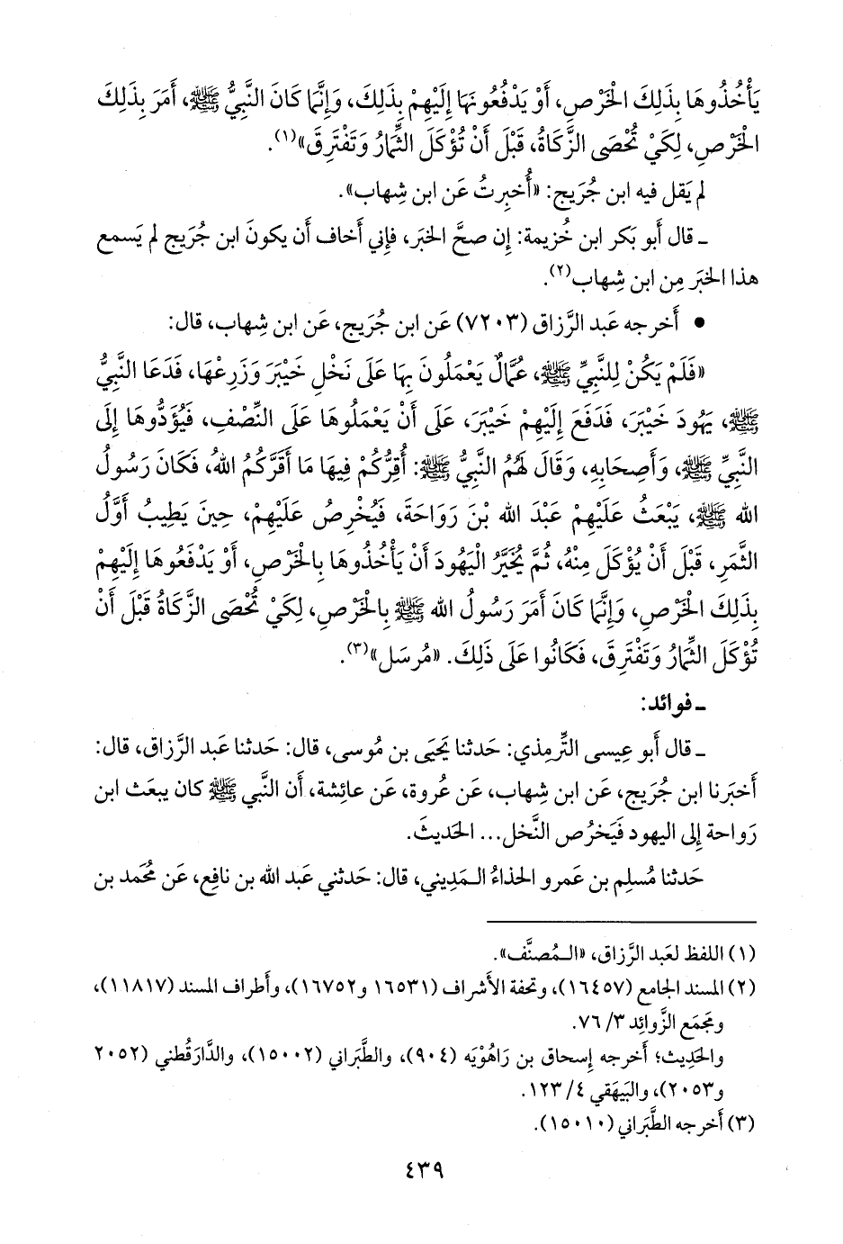 «فلم يكن للنبي صَلى الله عَليه وسَلم عمال يعملون بها على نخل خيبر وزرعها، فدعا النبي صَلى الله عَليه وسَلم يهود خيبر، فدفع إليهم خيبر، على أن يعملوها على النصف، فيؤدوها إلى النبي صَلى الله عَليه وسَلم وأصحابه، وقال لهم النبي صَلى الله عَليه وسَلم: أقركم فيها ما أقركم الله، فكان رسول الله صَلى الله عَليه وسَلم يبعث عليهم عبد الله بن رَوَاحة، فيخرص عليهم، حين يطيب أول الثمر، قبل أن يؤكل منه، ثم يخير اليهود أن ياخذوها بالخرص، أو يدفعوها إليهم بذلك الخرص، وإنما كان أمر رسول الله صَلى الله عَليه وسَلم بالخرص، لكي تحصى الزكاة قبل أن تؤكل الثمار وتفترق، فكانوا على ذلك. «مُرسَل» (¬٢).