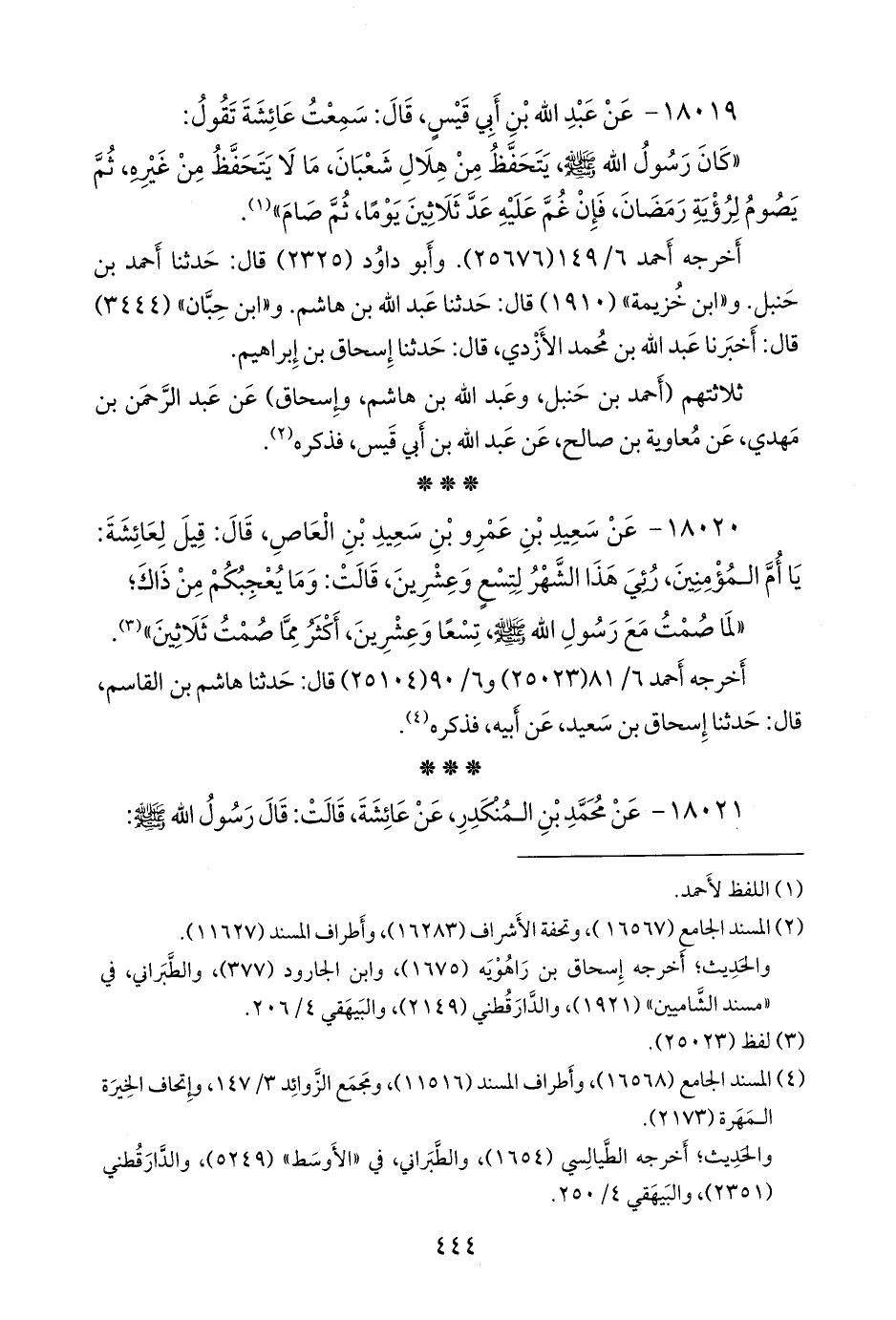 ١٨٠٢٠ - عن سعيد بن عَمرو بن سعيد بن العاص، قال: قيل لعائشة: يا أُم المؤمنين، رئي هذا الشهر لتسع وعشرين، قالت: وما يعجبكم من ذاك؛