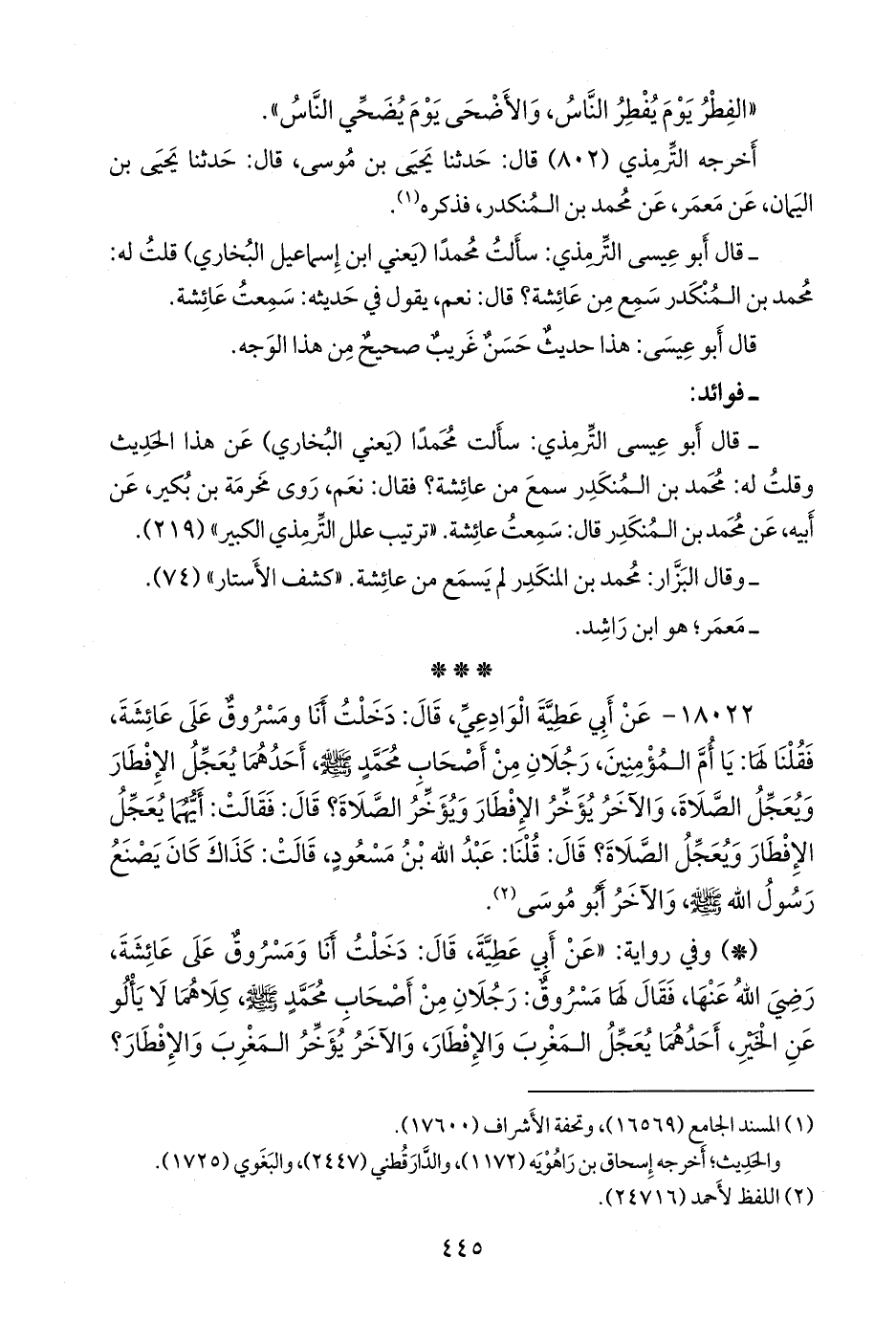 ١٨٠٢٢ - عن أبي عطية الوادعي، قال: دخلت أنا ومسروق على عائشة، فقلنا لها: يا أُم المؤمنين، رجلان من أصحاب محمد صَلى الله عَليه وسَلم أحدهما يعجل الإفطار ويعجل الصلاة، والآخر يؤخر الإفطار ويؤخر الصلاة؟ قال: فقالت: أيهما يعجل الإفطار ويعجل الصلاة؟ قال: قلنا: عبد الله بن مسعود، قالت: كذاك كان يصنع رسول الله صَلى الله عَليه وسَلم والآخر أَبو موسى (¬١).