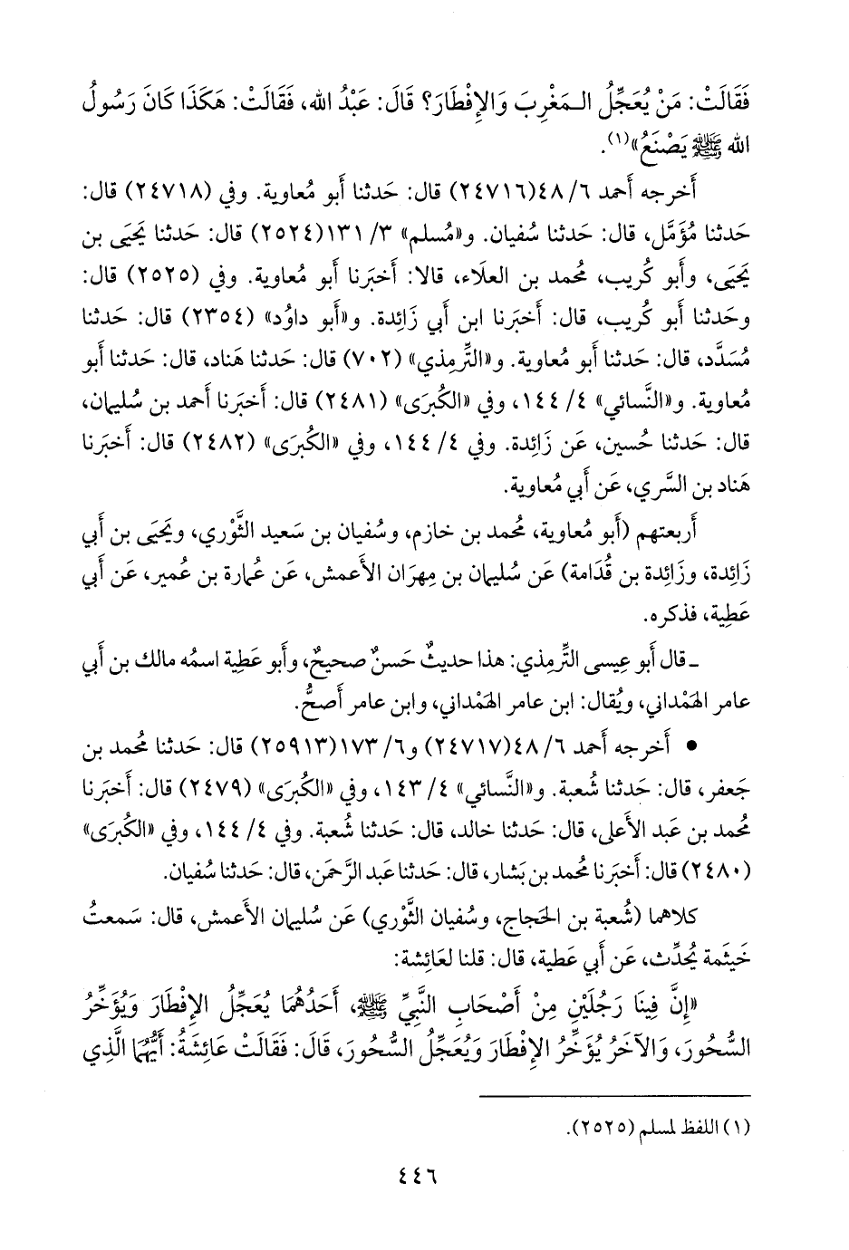 «إن فينا رجلين من أصحاب النبي صَلى الله عَليه وسَلم أحدهما يعجل الإفطار ويؤخر السحور، والآخر يؤخر الإفطار ويعجل السحور، قال: فقالت عائشة: أيهما الذي
