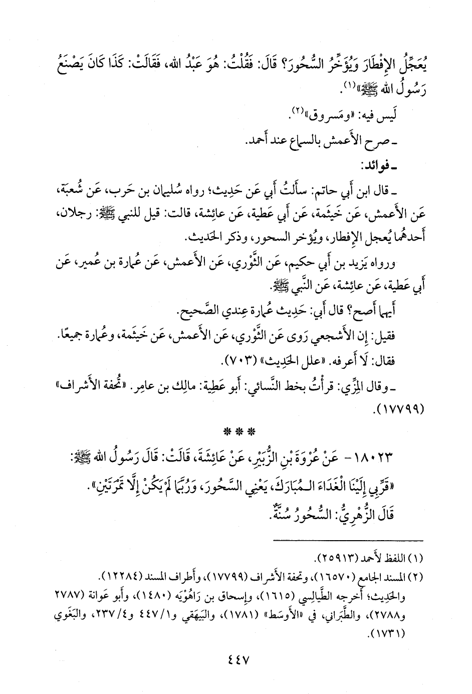 - قال عبد الرَّحمَن بن أبي حاتم الرازي: سألتُ أبي عن حديثٍ؛ رواه سليمان بن حرب، عن شعبة، عن الأعمش، عن خيثمة، عن أبي عطية، عن عائشة، قالت: قيل للنبي صَلى الله عَليه وسَلم: رجلان، أحدهما يعجل الإفطار، ويؤخر السحور، وذكر الحديث.