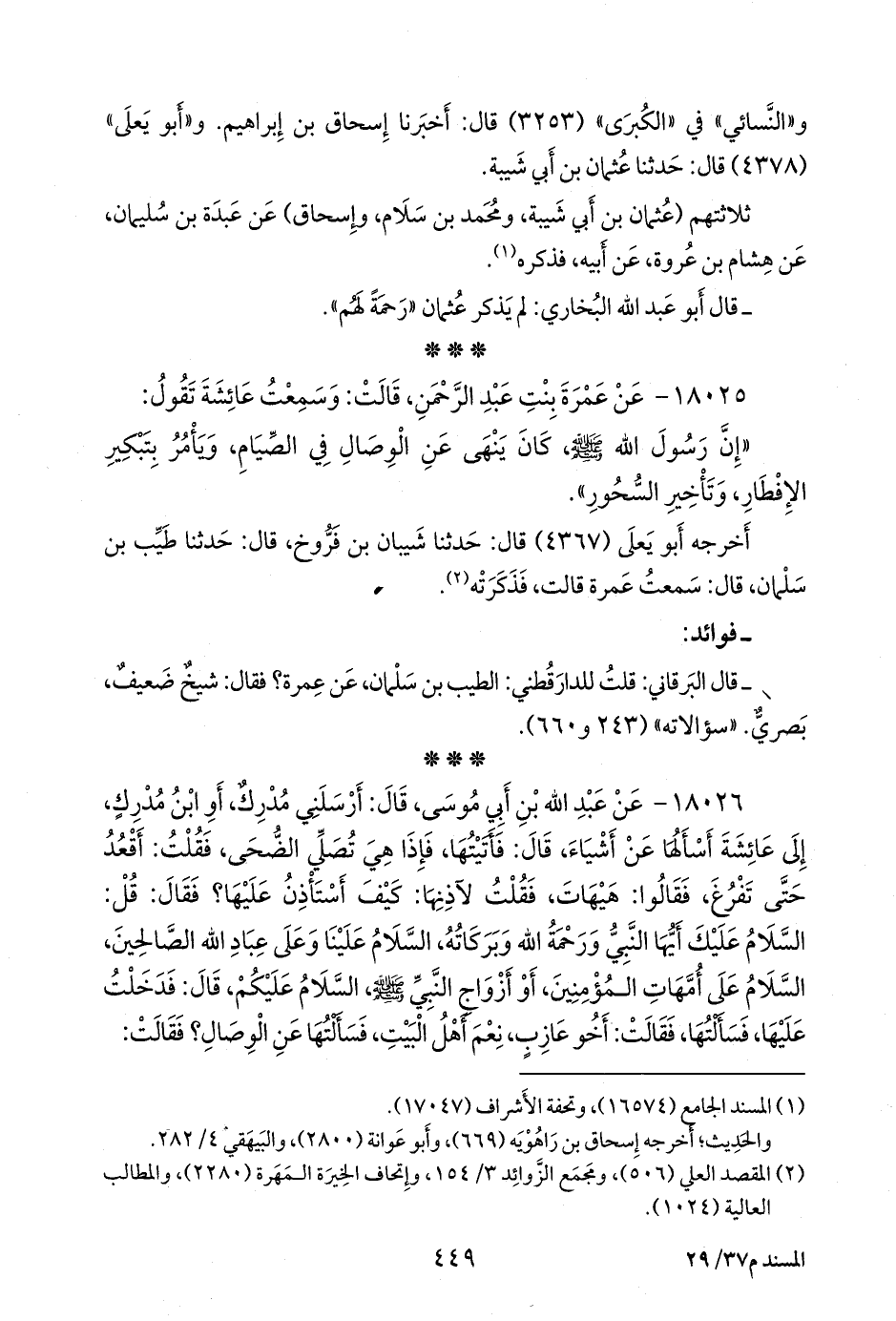 ١٨٠٢٦ - عن عبد الله بن أبي موسى، قال: أرسلني مدرك، أو ابن مدرك، إلى عائشة أسألها عن أشياء، قال: فأتيتها، فإذا هي تصلي الضحى، فقلت: أقعد حتى تفرغ، فقالوا: هيهات، فقلت لآذنها: كيف أستاذن عليها؟ فقال: قل: السلام عليك أيها النبي ورحمة الله وبركاته، السلام علينا وعلى عباد الله الصالحين، السلام على أمهات المؤمنين، أو أزواج النبي صَلى الله عَليه وسَلم السلام عليكم، قال: فدخلت عليها، فسألتها، فقالت: أخو عازب، نعم أهل البيت، فسألتها عن الوصال؟ فقالت: