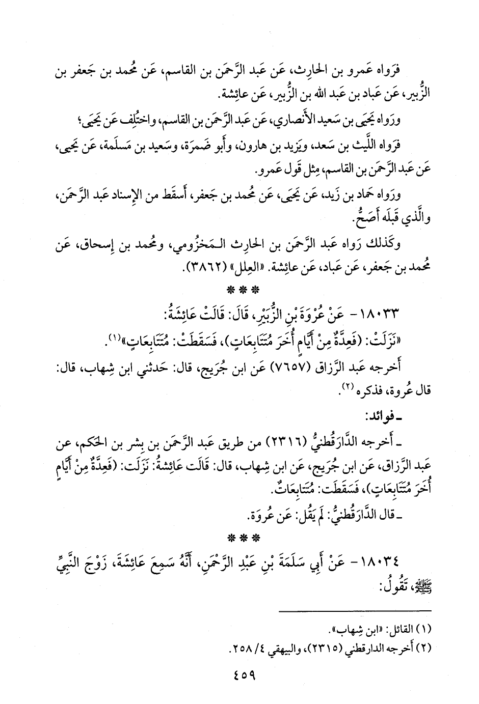 - أخرجه الدارقُطني (٢٣١٦) من طريق عبد الرَّحمَن بن بشر بن الحكم، عن عبد الرزاق، عن ابن جُريج، عن ابن شهاب، قال: قالت عائشة: نزلت: (فعدة من أيام أخر متتابعات)، فسقطت: متتابعات.