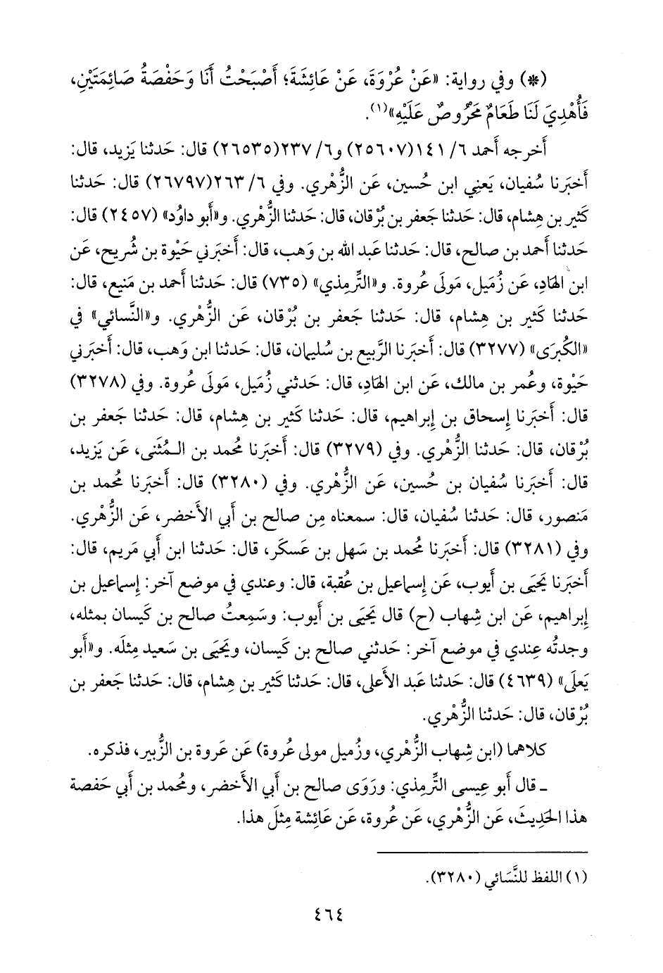أخرجه أحمد (٢٥٦٠٧) و ٦/ ٢٣٧ (٢٦٥٣٥) قال: حدثنا يزيد، قال: أخبرنا سفيان، يعني ابن حسين، عن الزُّهْري. وفي ٦/ ٢٦٣ (٢٦٧٩٧) قال: حدثنا كثير بن هشام، قال: حدثنا جعفر بن برقان، قال: حدثنا الزُّهْري. و «أَبو داود» (٢٤٥٧) قال: حدثنا أحمد بن صالح, قال: حدثنا عبد الله بن وهب، قال: أخبرني حَيْوَة بن شُرَيح، عن ابن الهاد، عن زميل مولى عروة. و «التِّرمِذي» (٧٣٥) قال: حدثنا أحمد بن مَنيع, قال: حدثنا كثير بن هشام, قال: حدثنا جعفر بن برقان، عن الزُّهْري. و «النَّسَائي» في «الكبرى» (٣٢٧٧) قال: أخبرنا الربيع بن سليمان، قال: حدثنا ابن وهب، قال: أخبرني حيوة، وعمر بن مالك، عن ابن الهاد، قال: حدثني زميل مولى عروة. وفي (٣٢٧٨) قال: أخبرنا إسحاق بن إبراهيم، قال: حدثنا كثير بن هشام، قال: حدثنا جعفر بن برقان، قال: حدثنا الزُّهْري. وفي (٣٢٧٩) قال: أخبرنا محمد بن المثنى، عن يزيد، قال: أخبرنا سفيان بن حسين، عن الزُّهْري. وفي (٣٢٨٠) قال: أخبرنا محمد بن منصور، قال: حدثنا سفيان، قال: سمعناه من صالح بن أبي الأخضر، عن الزُّهْري.