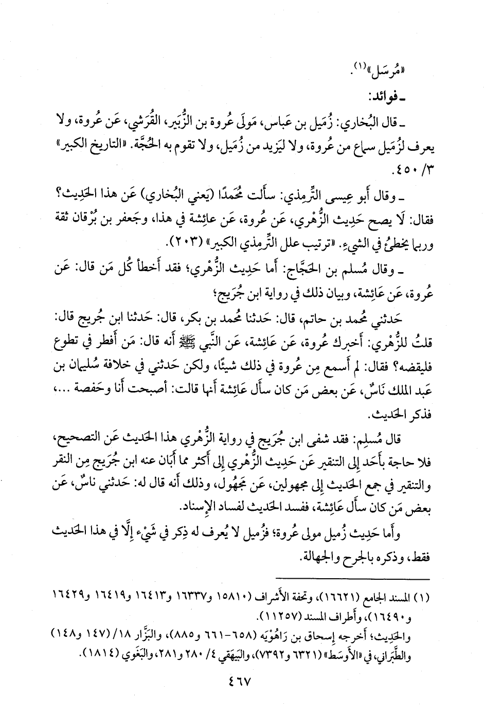 قال مسلم: فقد شفى ابن جُريج في رواية الزُّهْري هذا الحديث عن التصحيح، فلا حاجة بأحد إلى التنقير عن حديث الزُّهْري إلى أكثر مما أبان عنه ابن جُريج من النقر والتنقير في جمع الحديث إلى مجهولين، عن مجهول، وذلك أنه قال له: حدثني ناس، عن بعض من كان سأل عائشة، ففسد الحديث لفساد الإسناد.