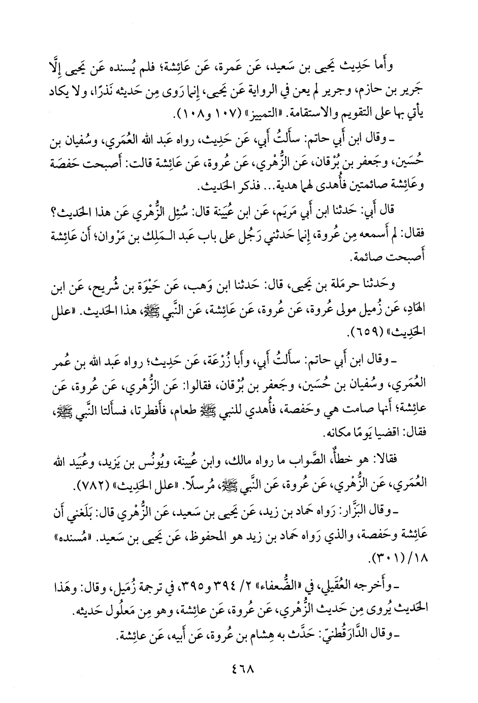 - وقال ابن أبي حاتم: سألت أبي، وأَبا زُرعَة، عن حديث؛ رواه عبد الله بن عمر العُمَري، وسفيان بن حسين، وجعفر بن برقان، فقالوا: عن الزُّهْري، عن عروة، عن عائشة؛ أنها صامت هي وحفصة، فأهدي للنبي صَلى الله عَليه وسَلم طعام، فأفطرتا، فسألتا النبي صَلى الله عَليه وسَلم فقال: اقضيا يوما مكانه.