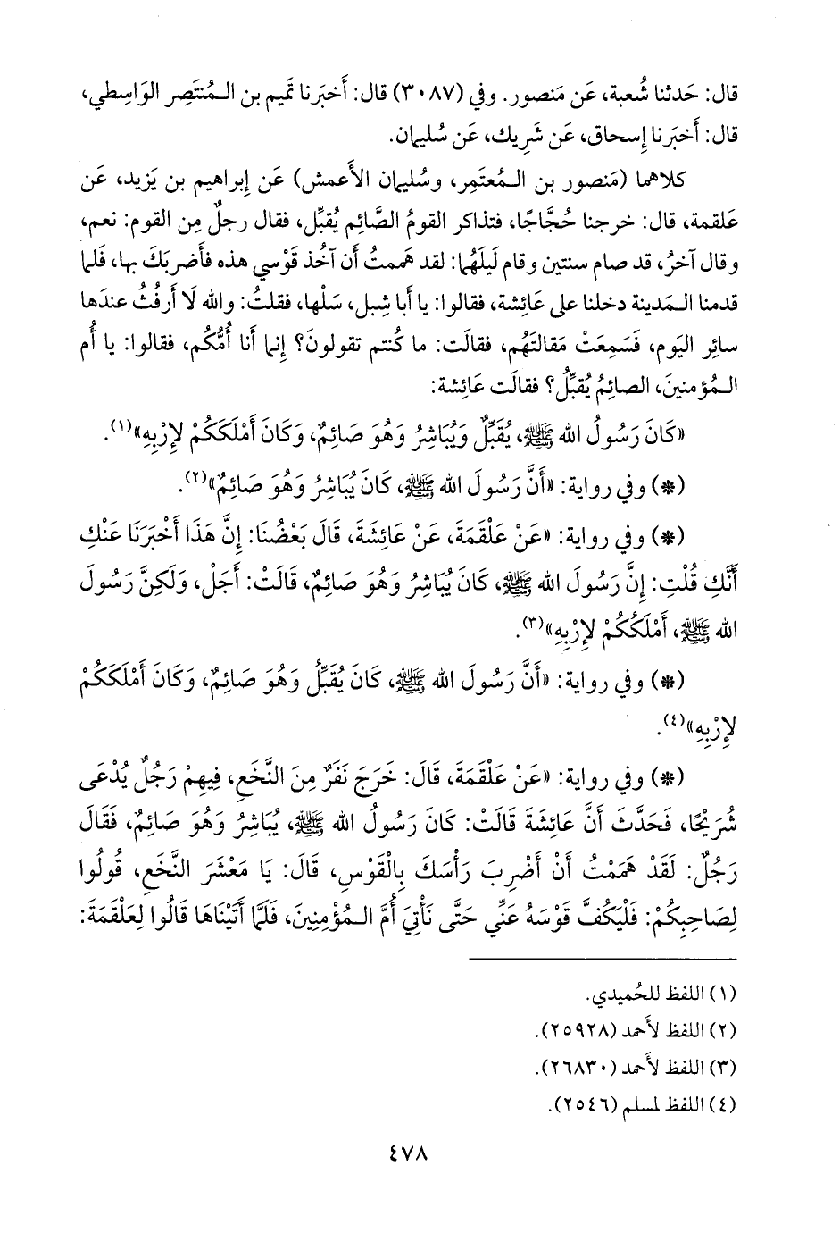 - وفي رواية: «عن علقمة، قال: خرج نفر من النخع، فيهم رجل يدعى شريحا، فحدث أن عائشة قالت: كان رسول الله صَلى الله عَليه وسَلم يباشر وهو صائم، فقال رجل: لقد هممت أن أضرب راسك بالقوس، قال: يا معشر النخع، قولوا لصاحبكم: فليكف قوسه عني حتى ناتي أُم المؤمنين، فلما أتيناها قالوا لعلقمة: