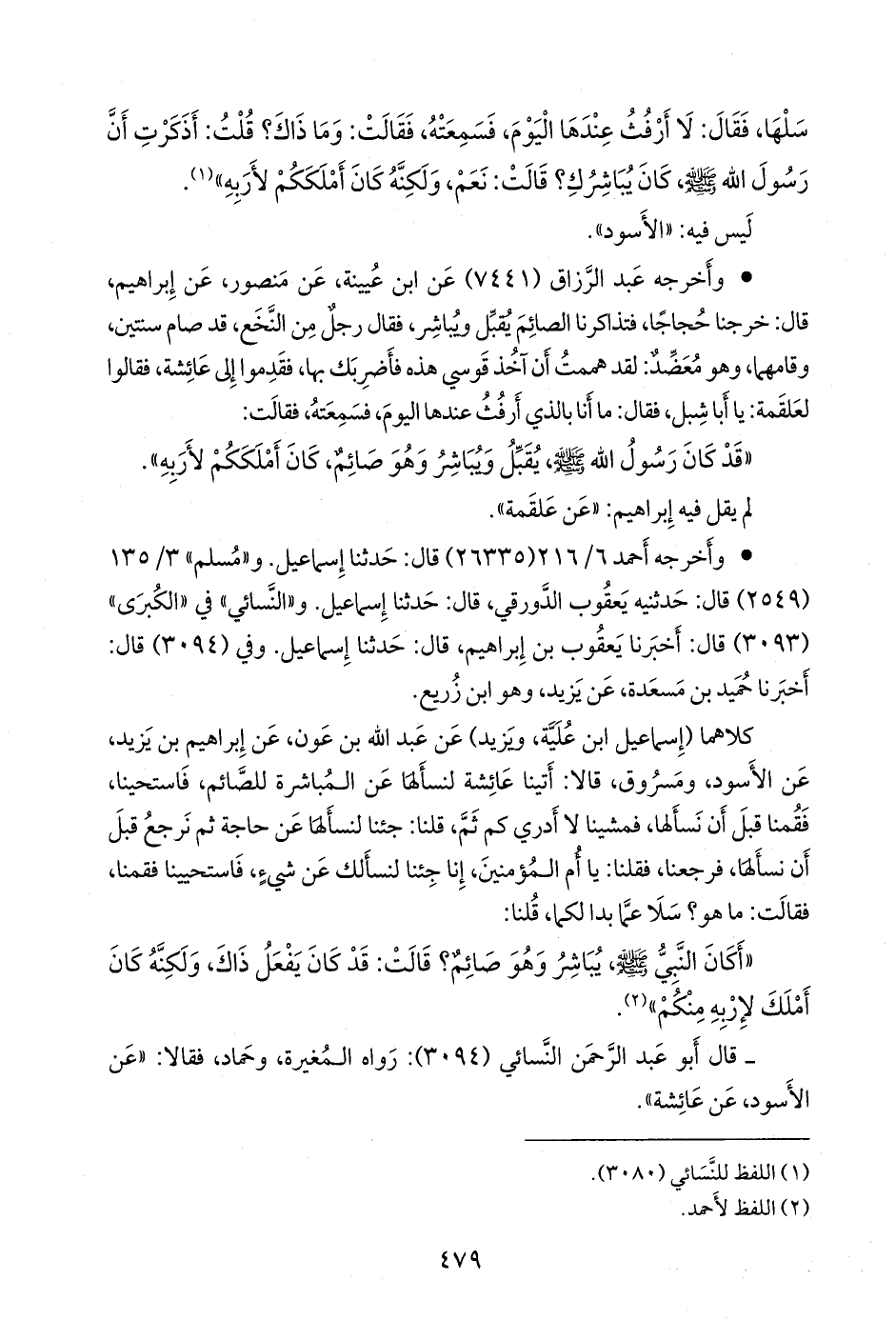 • وأخرجه عبد الرزاق (٧٤٤١) عن ابن عُيينة، عن منصور، عن إبراهيم، قال: خرجنا حجاجا، فتذاكرنا الصائم يقبل ويباشر، فقال رجل من النخع، قد صام سنتين، وقامهما، وهو معضد: لقد هممت أن آخذ قوسي هذه فأضربك بها، فقدموا إلى عائشة، فقالوا لعلقمة: يا أبا شبل، فقال: ما أنا بالذي أرفث عندها اليوم، فسمعته، فقالت: