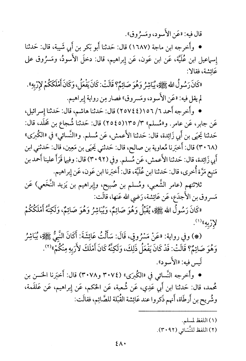 - وأخرجه ابن ماجة (١٦٨٧) قال: حدثنا أَبو بكر بن أبي شيبة, قال: حدثنا إسماعيل ابن عُلَية، عن ابن عَون، عن إبراهيم، قال: دخل الأسود، ومسروق على عائشة، فقالا: