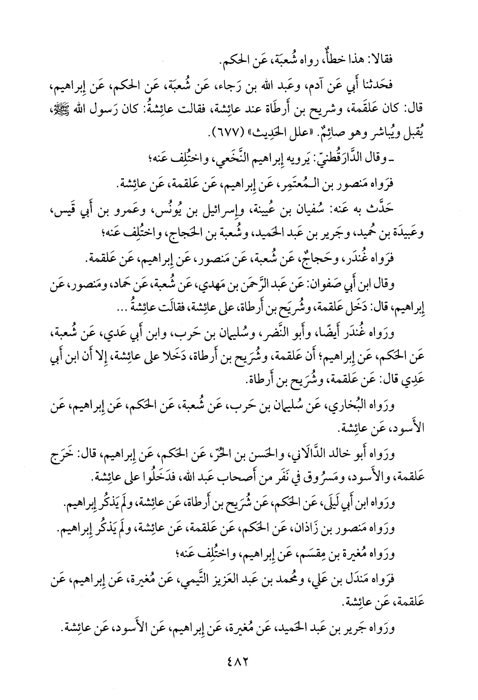 ورواه ابن أبي ليلى، عن الحكم، عن شريح بن أَرطَاة، عن عائشة، ولم يذكر إبراهيم.