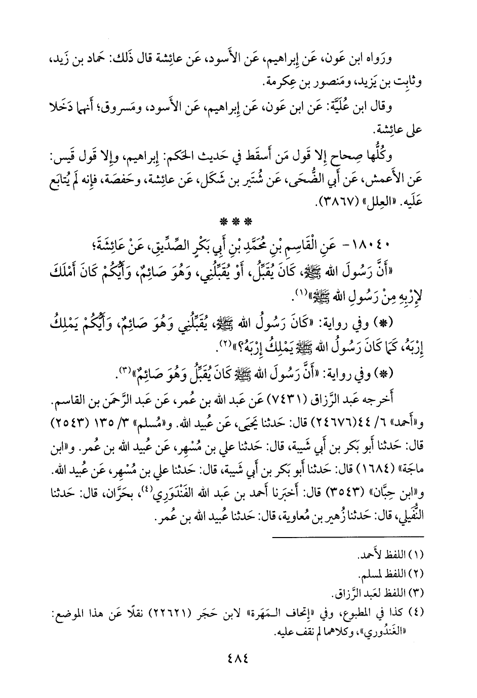 أخرجه عبد الرزاق (٧٤٣١) عن عبد الله بن عمر، عن عبد الرَّحمَن بن القاسم. و «أحمد» ٦/ ٤٤ (٢٤٦٧٦) قال: حدثنا يحيى، عن عُبيد الله. و «مسلم» ٣/ ١٣٥ (٢٥٤٣) قال: حدثنا أَبو بكر بن أبي شيبة, قال: حدثنا علي بن مُسهِر، عن عُبيد الله بن عمر. و «ابن ماجة» (١٦٨٤) قال: حدثنا أَبو بكر بن أبي شيبة, قال: حدثنا علي بن مُسهِر، عن عُبيد الله. و «ابن حِبَّان» (٣٥٤٣) قال: أخبرنا أحمد بن عبد الله القَنْدَوَري (¬٤)، بحران، قال: حدثنا النفيلي، قال: حدثنا زهير بن معاوية، قال: حدثنا عُبيد الله بن عمر.