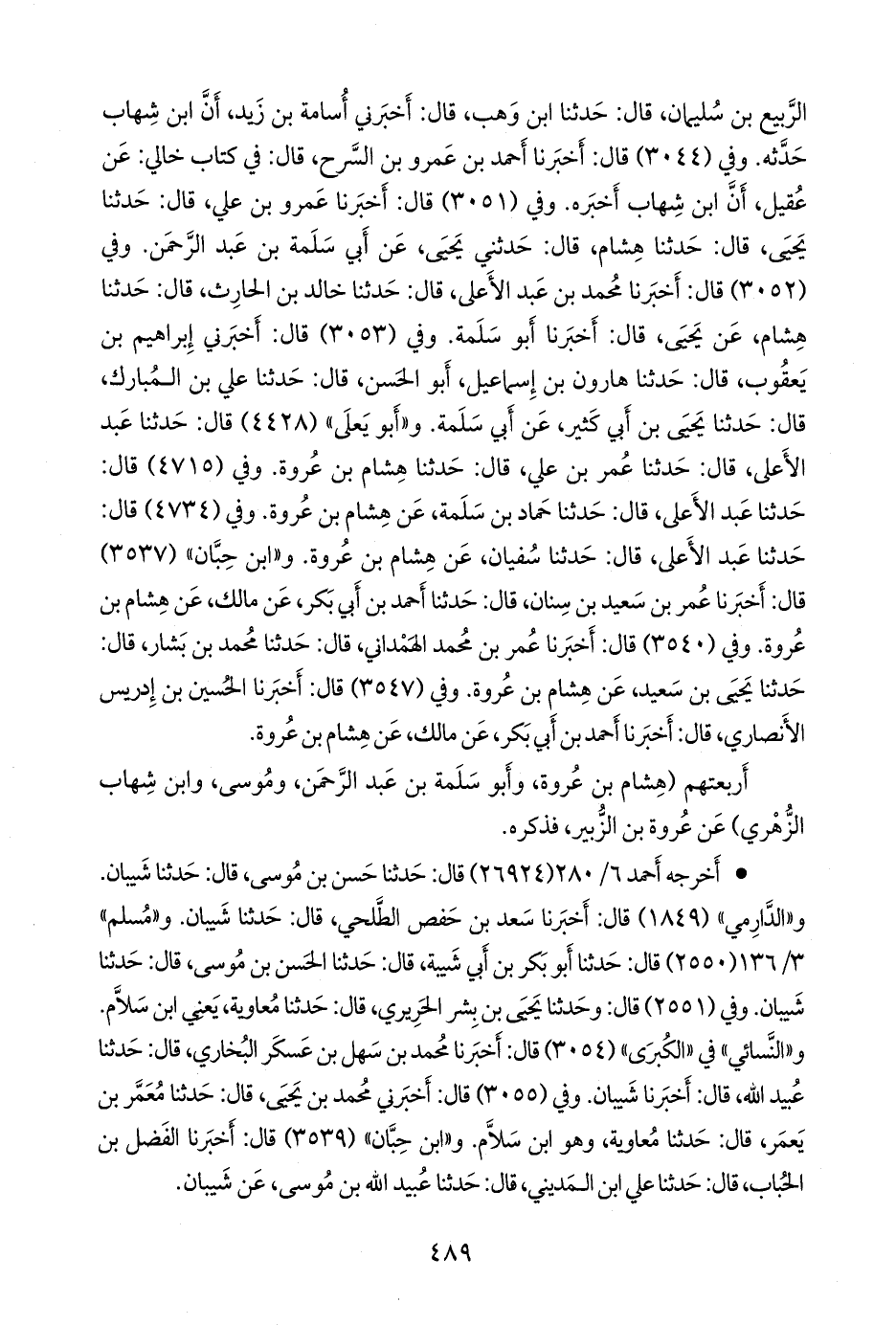 وفي (٣٠٤٤) قال: أخبرنا أحمد بن عَمرو بن السَّرح، قال: في كتاب خالي: عن عقيل، أن ابن شهاب أخبره. وفي (٣٠٥١) قال: أخبرنا عَمرو بن علي، قال: حدثنا يحيى، قال: حدثنا هشام، قال: حدثني يحيى، عن أبي سلمة بن عبد الرَّحمَن. وفي (٣٠٥٢) قال: أخبرنا محمد بن عبد الأعلى، قال: حدثنا خالد بن الحارث، قال: حدثنا هشام، عن يحيى، قال: أخبرنا أَبو سلمة. وفي (٣٠٥٣) قال: أخبرني إبراهيم بن يعقوب، قال: حدثنا هارون بن إسماعيل، أَبو الحسن، قال: حدثنا علي بن المبارك، قال: حدثنا يحيى بن أبي كثير، عن أبي سلمة. و «أَبو يَعلى» (٤٤٢٨) قال: حدثنا عبد الأعلى، قال: حدثنا عمر بن علي، قال: حدثنا هشام بن عروة. وفي (٤٧١٥) قال: حدثنا عبد الأعلى، قال: حدثنا حماد بن سلمة، عن هشام بن عروة. وفي (٤٧٣٤) قال: حدثنا عبد الأعلى، قال: حدثنا سفيان، عن هشام بن عروة. و «ابن حِبَّان» (٣٥٣٧) قال: أخبرنا عمر بن سعيد بن سنان، قال: حدثنا أحمد بن أَبي بكر، عن مالك، عن هشام بن عروة. وفي (٣٥٤٠) قال: أخبرنا عمر بن محمد الهمداني، قال: حدثنا محمد بن بشار، قال: حدثنا يحيى بن سعيد، عن هشام بن عروة. وفي (٣٥٤٧) قال: أخبرنا الحسين بن إدريس الأَنصاري، قال: أخبرنا أحمد بن أَبي بكر، عن مالك، عن هشام بن عروة.