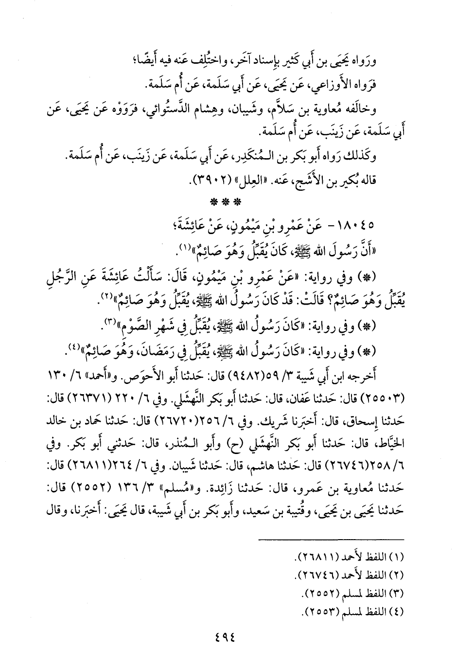 - وفي رواية: «عن عَمرو بن ميمون، قال: سألت عائشة عن الرجل يقبل وهو صائم؟ قالت: قد كان رسول الله صَلى الله عَليه وسَلم يقبل وهو صائم» (¬٢).