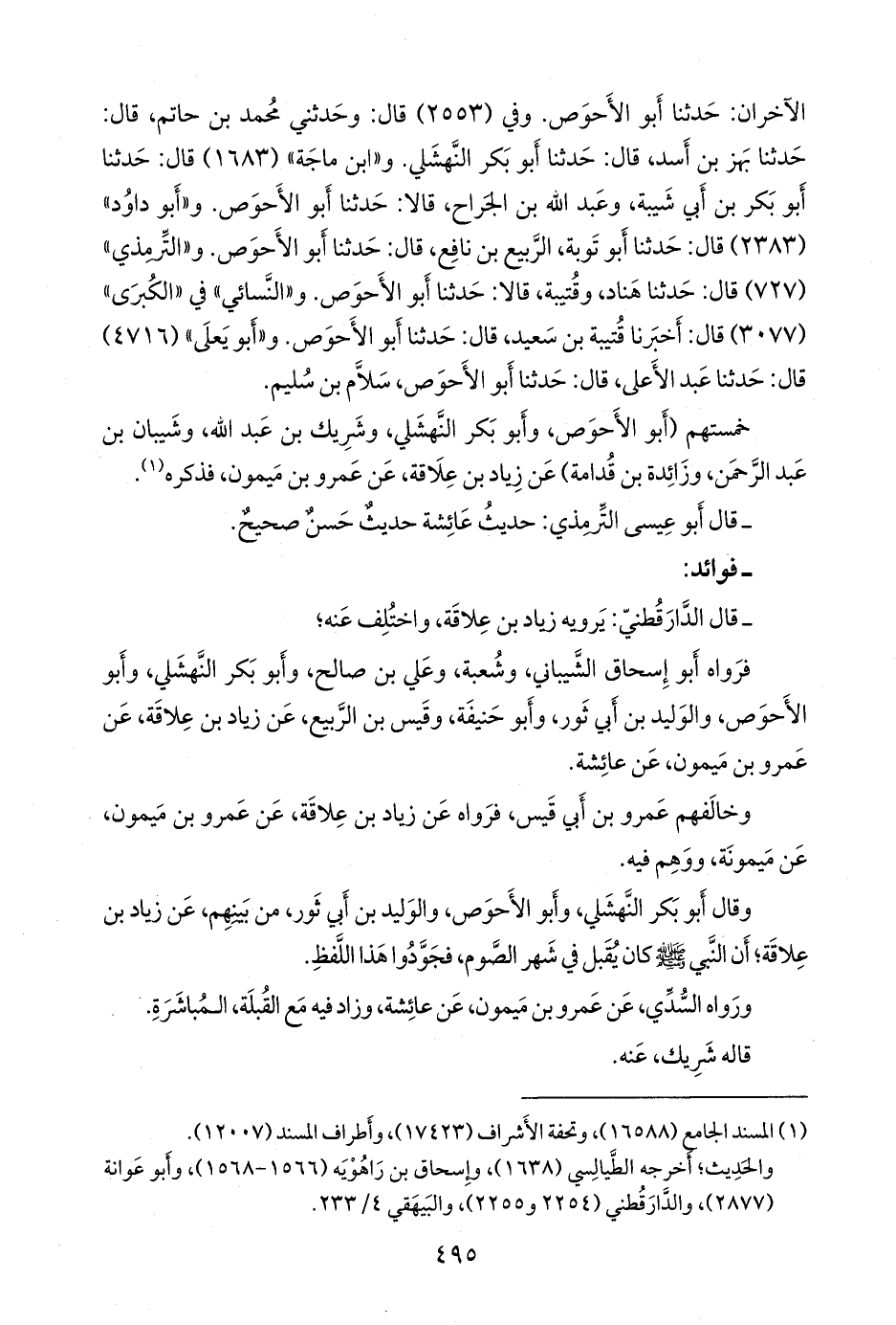 وقال أَبو بكر النهشلي، وأَبو الأحوص، والوليد بن أبي ثور، من بينهم، عن زياد بن علاقة؛ أن النبي صَلى الله عَليه وسَلم كان يقبل في شهر الصوم، فجودوا هذا اللفظ.
