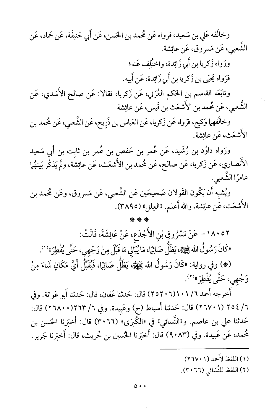 ستتهم (أَبو عَوانة، الوضاح بن عبد الله، وأسباط بن محمد، وعَبيدة بن حُميد، وعلي بن عاصم، وجرير بن عبد الحميد، ومحمد بن فضيل) عن مطرف بن طريف، عن عامر بن شراحيل الشعبي، عن مسروق، فذكره (¬٣).