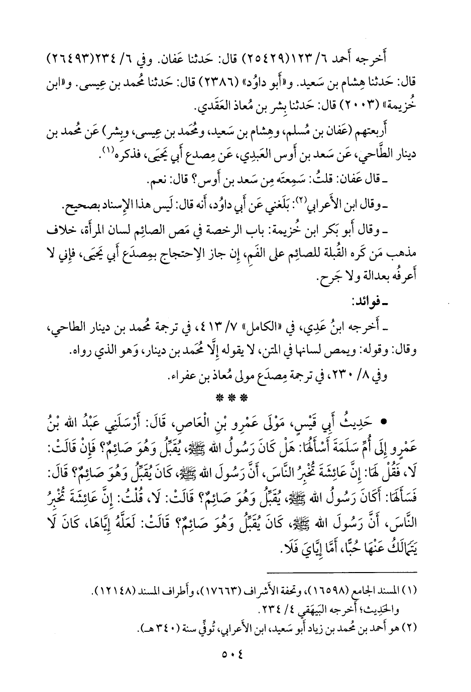 • حديث أبي قيس مولى عَمرو بن العاص، قال: أرسلني عبد الله بن عَمرو إلى أُم سلمة أسألها: هل كان رسول الله صَلى الله عَليه وسَلم يقبل وهو صائم؟ فإن قالت: لا، فقل لها: إن عائشة تخبر الناس، أن رسول الله صَلى الله عَليه وسَلم كان يقبل وهو صائم؟ قال: فسألها: أكان رسول الله صَلى الله عَليه وسَلم يقبل وهو صائم؟ قالت: لا، قلت: إن عائشة تخبر الناس، أن رسول الله صَلى الله عَليه وسَلم كان يقبل وهو صائم؟ قالت: لعله إياها، كان لا يتمالك عنها حبا، أما إياي فلا.