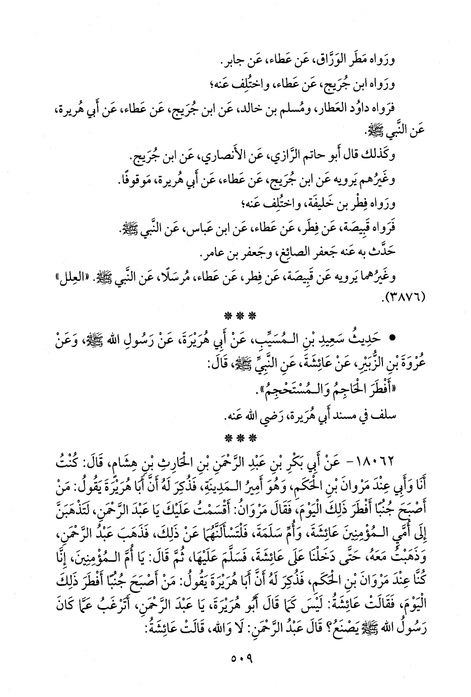 ١٨٠٦٢ - عن أَبي بكر بن عبد الرَّحمَن بن الحارث بن هشام، قال: كنت أنا وأبي عند مروان بن الحكم، وهو أمير المدينة، فذكر له أن أبا هريرة يقول: من أصبح جنبا أفطر ذلك اليوم، فقال مروان: أقسمت عليك يا عبد الرَّحمَن، لتذهبن إلى أمي المؤمنين عائشة، وأُم سلمة، فلتسألنهما عن ذلك، فذهب عبد الرَّحمَن، وذهبت معه، حتى دخلنا على عائشة، فسلم عليها، ثم قال: يا أُم المؤمنين، إنا كنا عند مروان بن الحكم، فذكر له أن أبا هريرة يقول: من أصبح جنبا أفطر ذلك اليوم، فقالت عائشة: ليس كما قال أَبو هريرة، يا عبد الرَّحمَن، أترغب عما كان رسول الله صَلى الله عَليه وسَلم يصنع؟ قال عبد الرَّحمَن: لا والله، قالت عائشة:
