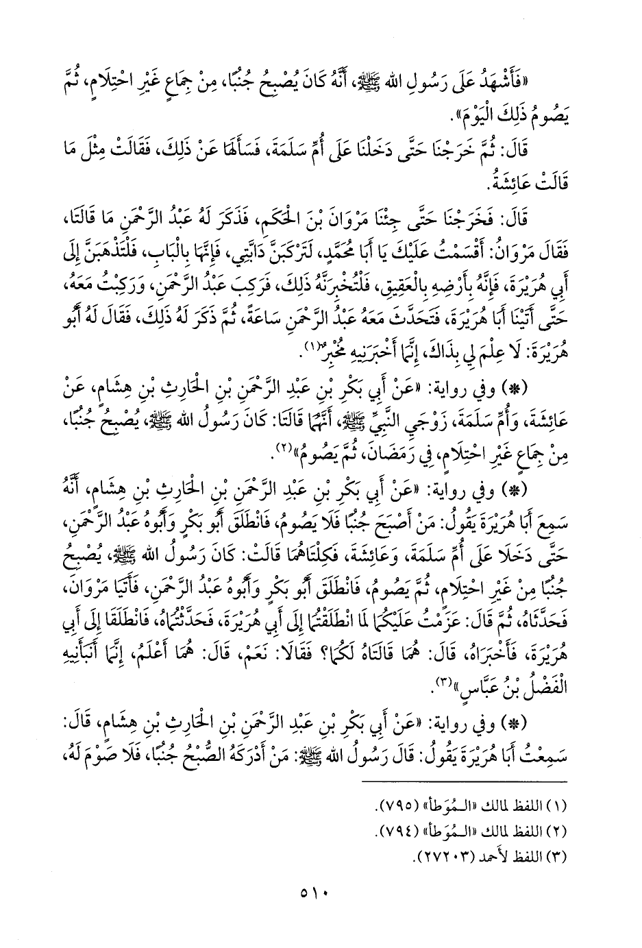 - وفي رواية: «عن أَبي بكر بن عبد الرَّحمَن بن الحارث بن هشام، أنه سمع أبا هريرة يقول: من أصبح جنبا فلا يصوم، فانطلق أَبو بكر وأَبوه عبد الرَّحمَن، حتى دخلا على أُم سلمة، وعائشة، فكلتاهما قالت: كان رسول الله صَلى الله عَليه وسَلم يصبح جنبا من غير احتلام، ثم يصوم، فانطلق أَبو بكر وأَبوه عبد الرَّحمَن، فأتيا مروان، فحدثاه، ثم قال: عزمت عليكما لما انطلقتما إلى أبي هريرة، فحدثتماه، فانطلقا إلى أبي هريرة، فأخبراه، قال: هما قالتاه لكما؟ فقالا: نعم، قال: هما أعلم، إنما أنبأنيه الفضل بن عباس» (¬١).