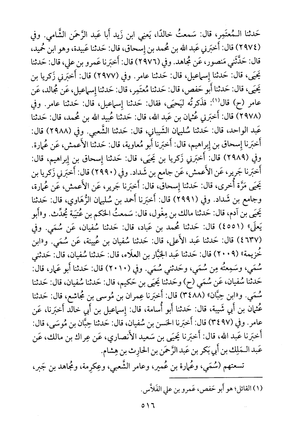 وفي (٢٩٧٤) قال: أخبرني عبد الله بن محمد بن إسحاق، قال: حدثنا عبيدة، وهو ابن حميد، قال: حدثني منصور، عن مجاهد. وفي (٢٩٧٦) قال: أخبرنا عَمرو بن علي، قال: حدثنا يحيى، قال: حدثنا إسماعيل، قال: حدثنا عامر. وفي (٢٩٧٧) قال: أخبرني زكريا بن يحيى، قال: حدثنا أَبو حفص، قال: حدثنا معتمر، قال: حدثنا إسماعيل، عن مجالد، عن عامر (ح) قال (¬١): فذكرته ليحيى، فقال: حدثنا إسماعيل، قال: حدثنا عامر. وفي (٢٩٧٨) قال: أخبرني عثمان بن عبد الله، قال: حدثنا عُبيد الله بن محمد، قال: حدثنا عبد الواحد، قال: حدثنا سليمان الشيباني، قال: حدثنا الشعبي. وفي (٢٩٨٨) قال: أخبرنا إسحاق بن إبراهيم، قال: أخبرنا أَبو معاوية، قال: حدثنا الأعمش، عن عمارة. وفي (٢٩٨٩) قال: أخبرني زكريا بن يحيى، قال: حدثنا إسحاق بن إبراهيم، قال: أخبرنا جرير، عن الأعمش، عن جامع بن شداد. وفي (٢٩٩٠) قال: أخبرني زكريا بن يحيى مرة أخرى، قال: حدثنا إسحاق، قال: أخبرنا جرير، عن الأعمش، عن عمارة، وجامع بن شداد. وفي (٢٩٩١) قال: أخبرنا أحمد بن سليمان الرُّهاوي، قال: حدثنا يحيى بن آدم، قال: حدثنا مالك بن مِغْوَل، قال: سمعت الحكم بن عتيبة يحدث. و «أَبو يَعلى» (٤٥٥١) قال: حدثنا محمد بن عباد، قال: حدثنا سفيان، عن سمي. وفي (٤٦٣٧) قال: حدثنا عبد الأعلى، قال: حدثنا سفيان بن عُيينة، عن سمي. و «ابن خزيمة» (٢٠٠٩) قال: حدثنا عبد الجبار بن العلاء, قال: حدثنا سفيان، قال: حدثني سمي، وسمعته من سمي، وحدثني سمي. وفي (٢٠١٠) قال: حدثنا أَبو عمار, قال: حدثنا سفيان، عن سمي (ح) وحدثنا يحيى بن حكيم, قال: حدثنا سفيان, قال: حدثنا سمي. و «ابن حِبَّان» (٣٤٨٨) قال: أخبرنا عمران بن موسى بن مجاشع، قال: حدثنا عثمان بن أبي شيبة، قال: حدثنا أَبو أسامة، قال: إسماعيل بن أبي خالد أخبرنا، عن عامر. وفي (٣٤٩٧) قال: أخبرنا الحسن بن سفيان، قال: حدثنا حِبَّان بن موسى، قال: أخبرنا عبد الله، قال: أخبرنا يحيى بن سعيد الأَنصاري، عن عراك بن مالك، عن عبد الملك بن أَبي بكر بن عبد الرَّحمَن بن الحارث بن هشام.