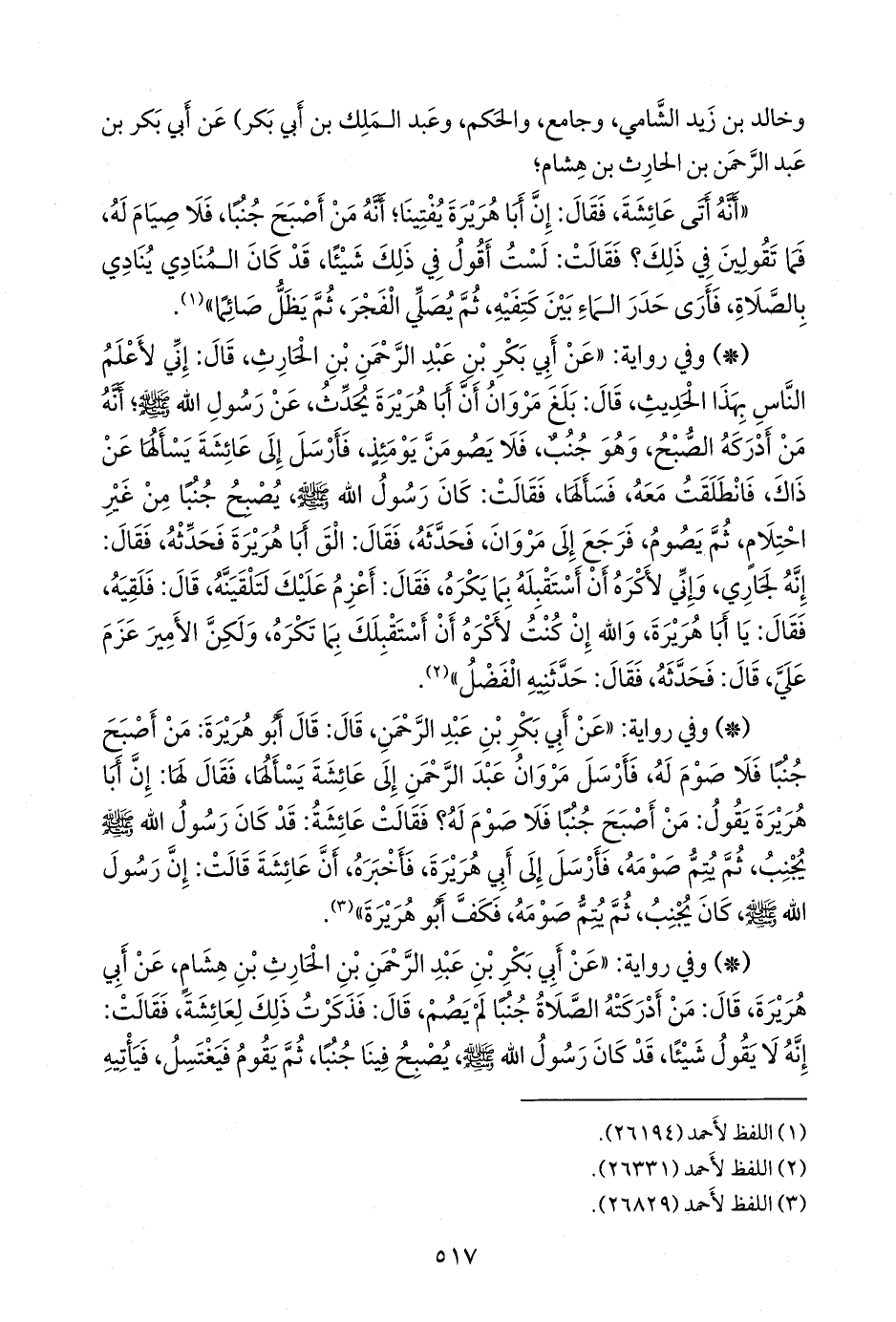 - وفي رواية: «عن أَبي بكر بن عبد الرَّحمَن، قال: قال أَبو هريرة: من أصبح جنبا فلا صوم له، فأرسل مروان عبد الرَّحمَن إلى عائشة يسألها، فقال لها: إن أبا هريرة يقول: من أصبح جنبا فلا صوم له؟ فقالت عائشة: قد كان رسول الله صَلى الله عَليه وسَلم يجنب، ثم يتم صومه، فأرسل إلى أبي هريرة، فأخبره، أن عائشة قالت: إن رسول الله صَلى الله عَليه وسَلم كان يجنب، ثم يتم صومه، فكف أَبو هريرة» (¬٣).