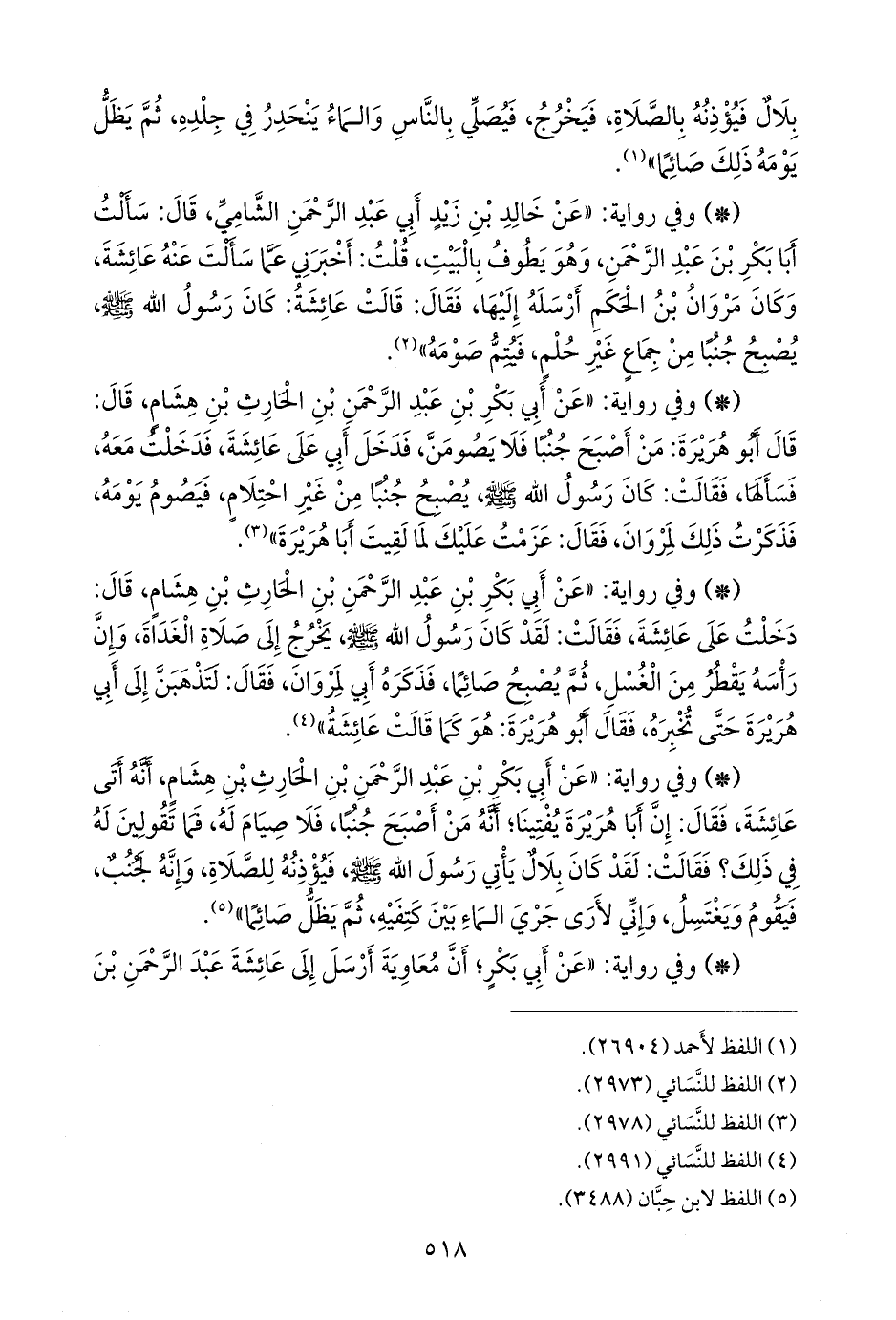 - وفي رواية: «عن خالد بن زيد أبي عبد الرَّحمَن الشامي، قال: سألتُ أَبا بكر بن عبد الرَّحمَن، وهو يطوف بالبيت، قلت: أخبرني عما سألت عنه عائشة، وكان مروان بن الحكم أرسله إليها، فقال: قالت عائشة: كان رسول الله صَلى الله عَليه وسَلم يصبح جنبا من جماع غير حلم، فيتم صومه» (¬١).