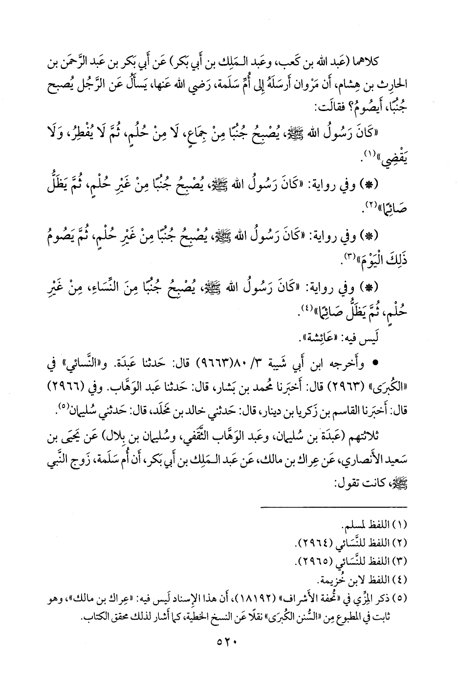 - وفي رواية: «كان رسول الله صَلى الله عَليه وسَلم يصبح جنبا من غير حلم، ثم يصوم ذلك اليوم» (¬٣).
