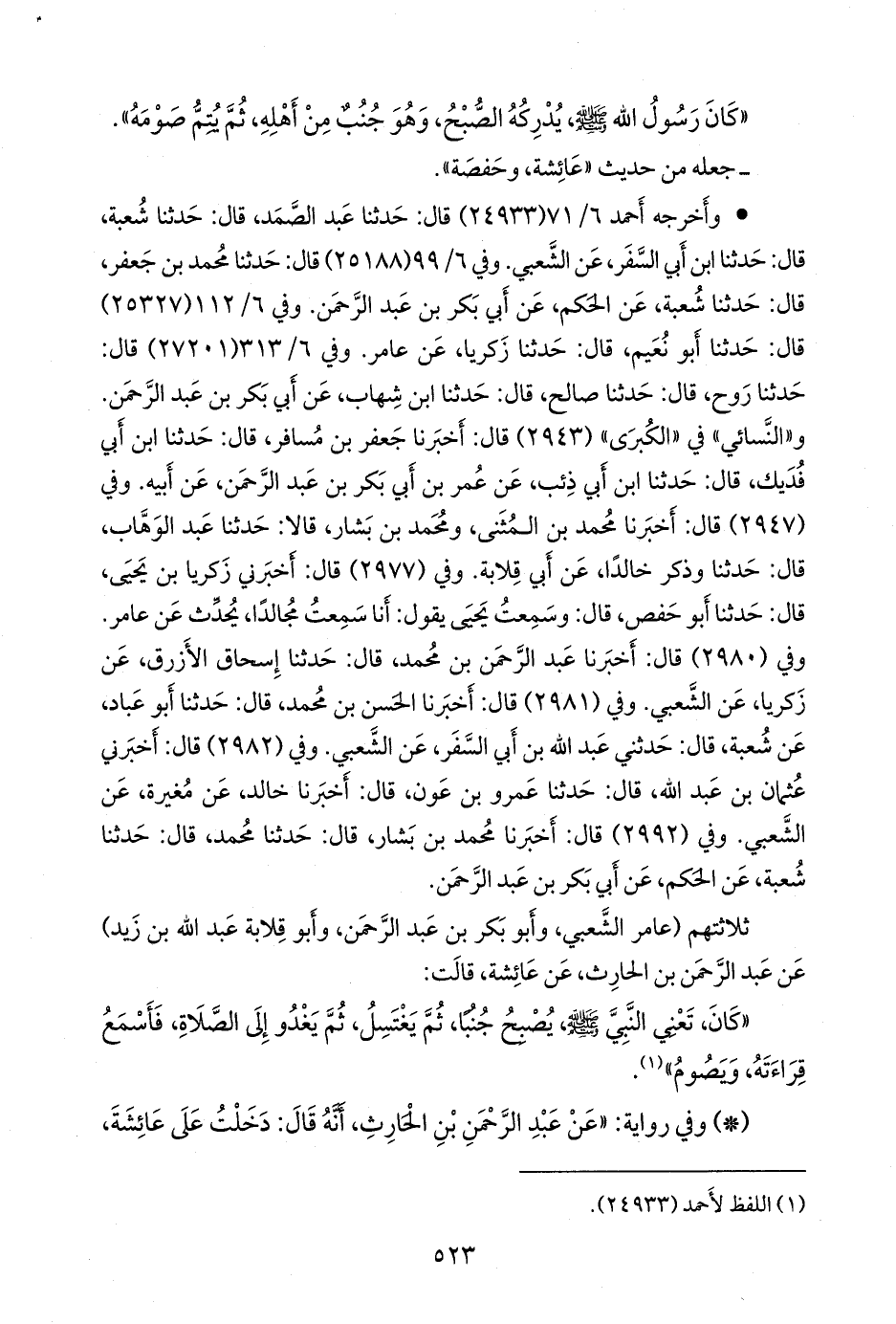 • وأخرجه أحمد (٢٤٩٣٣) قال: حدثنا عبد الصمد, قال: حدثنا شعبة، قال: حدثنا ابن أبي السفر، عن الشعبي. وفي ٦/ ٩٩ (٢٥١٨٨) قال: حدثنا محمد بن جعفر، قال: حدثنا شعبة، عن الحكم، عن أَبي بكر بن عبد الرَّحمَن. وفي ٦/ ١١٢ (٢٥٣٢٧) قال: حدثنا أَبو نُعيم, قال: حدثنا زكريا، عن عامر. وفي ٦/ ٣١٣ (٢٧٢٠١) قال: حدثنا روح، قال: حدثنا صالح, قال: حدثنا ابن شهاب، عن أَبي بكر بن عبد الرَّحمَن. و «النَّسَائي» في «الكبرى» (٢٩٤٣) قال: أخبرنا جعفر بن مسافر، قال: حدثنا ابن أبي فُديك، قال: حدثنا ابن أبي ذِئب، عن عمر بن أَبي بكر بن عبد الرَّحمَن، عن أبيه. وفي (٢٩٤٧) قال: أخبرنا محمد بن المثنى، ومحمد بن بشار، قالا: حدثنا عبد الوَهَّاب، قال: حدثنا وذكر خالدا، عن أبي قلابة. وفي (٢٩٧٧) قال: أخبرني زكريا بن يحيى، قال: حدثنا أَبو حفص، قال: وسمعت يحيى يقول: أنا سمعت مجالدا، يحدث عن عامر. وفي (٢٩٨٠) قال: أخبرنا عبد الرَّحمَن بن محمد، قال: حدثنا إسحاق الأزرق، عن زكريا، عن الشعبي. وفي (٢٩٨١) قال: أخبرنا الحسن بن محمد، قال: حدثنا أَبو عباد، عن شعبة، قال: حدثني عبد الله بن أبي السفر، عن الشعبي. وفي (٢٩٨٢) قال: أخبرني عثمان بن عبد الله، قال: حدثنا عَمرو بن عون، قال: أخبرنا خالد، عن مغيرة، عن الشعبي. وفي (٢٩٩٢) قال: أخبرنا محمد بن بشار، قال: حدثنا محمد، قال: حدثنا شعبة، عن الحكم، عن أَبي بكر بن عبد الرَّحمَن.