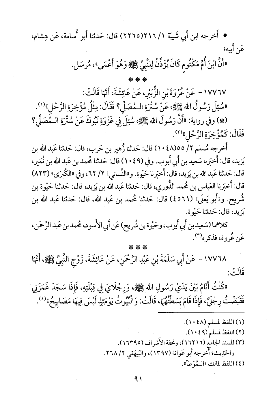 - وفي رواية: «كان رسول الله صَلى الله عَليه وسَلم يصلي صلاته من الليل، وأنا معترضة بينه وبين القبلة، فإذا أراد أن يوتر حركني برجله» (¬٢).