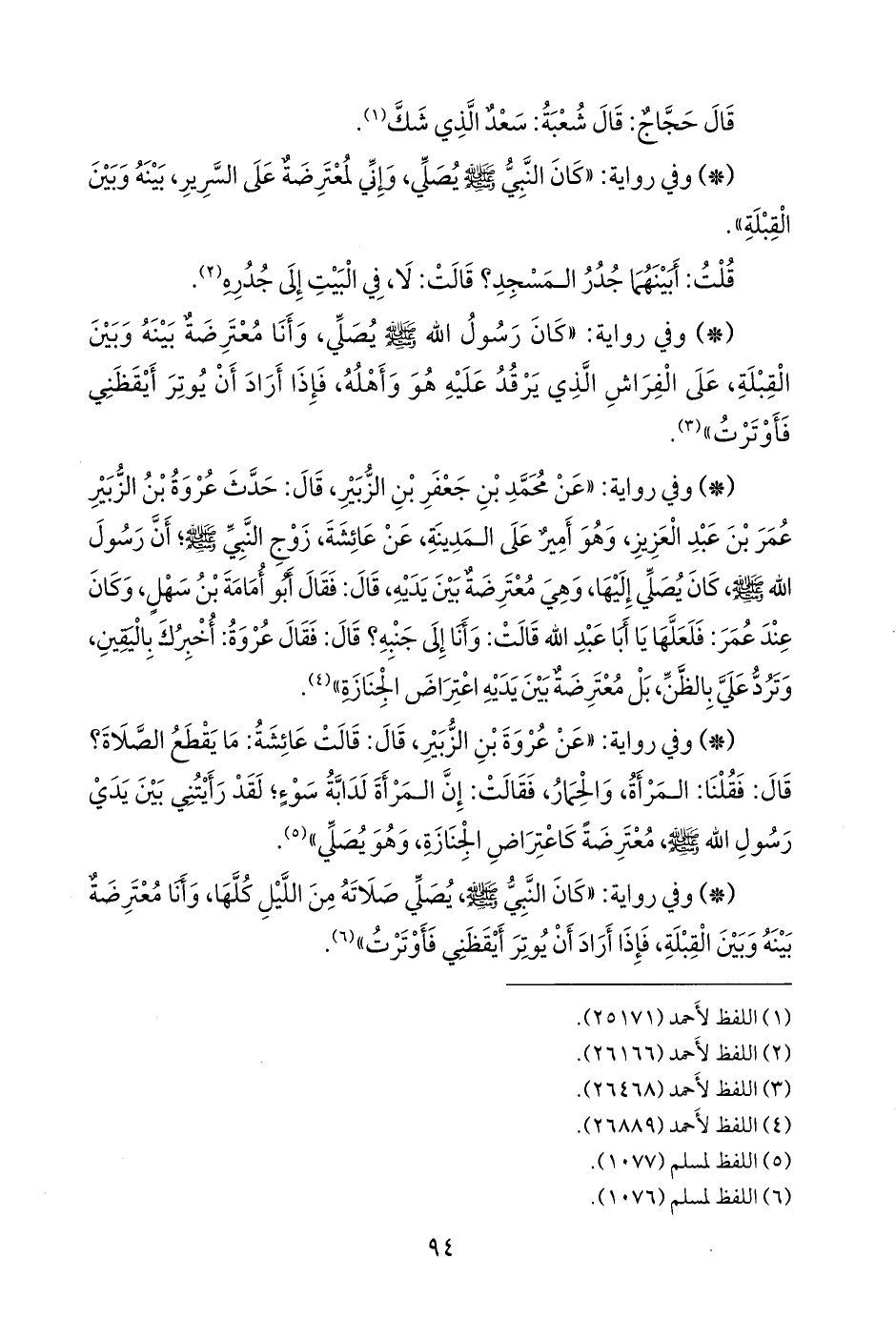 - وفي رواية: «كان رسول الله صَلى الله عَليه وسَلم يصلي، وأنا معترضة بينه وبين القبلة، كاعتراض الجِنازة، تحت قطيفتي» (¬٣).