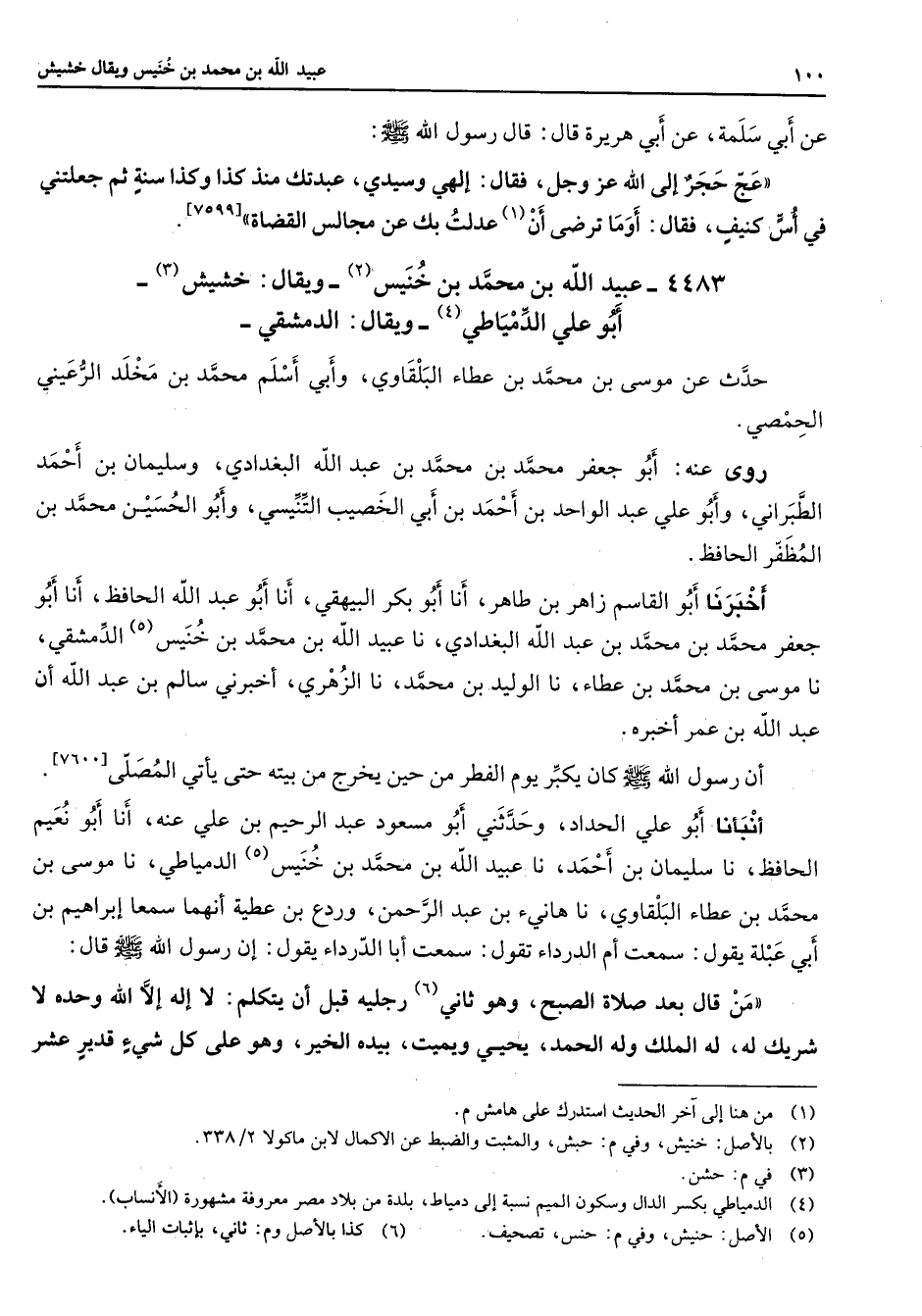 4483 - عبيد الله بن محمد بن خنيس (2) ويقال خشيش (3) أبو علي الدمياطي ويقال الدمشقي حدث عن موسى بن محمد بن عطاء البلقاوي وأبي أسلم محمد بن مخلد الرعيني الحمصي روى عنه أبو جعفر محمد بن محمد بن عبد الله البغدادي وسليمان بن أحمد الطبراني وأبو علي عبد الواحد بن أحمد بن أبي الخصيب التنيسي وأبو الحسين محمد بن المظفر الحافظ أخبرنا أبو القاسم زاهر بن طاهر أنا أبو بكر البيهقي أنا أبو عبد الله الحافظ أنا أبو جعفر محمد بن محمد بن عبد الله البغدادي نا عبيد الله بن محمد بن خنيس (5) الدمشقي نا موسى بن محمد بن عطاء نا الوليد بن محمد نا الزهري أخبرني سالم بن عبد الله أن عبد الله بن عمر أخبره أن رسول الله (صلى الله عليه وسلم) كان يكبر يوم الفطر من حين يخرج من بيته حتى يأتي المصلى