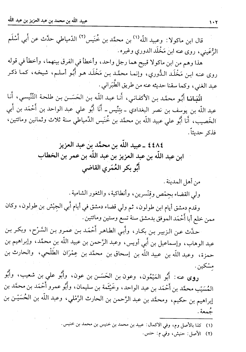 قال ابن ماكولا وعبيد الله (1) بن محمد بن خنيس (2) الدمياطي حدث عن أبي أسلم الرعيني روى عنه ابن مخلد الدوري وغيره هذا وهم من ابن ماكولا قبيح هما رجل واحد وأخطأ في الفرق بينهما وأخطأ في قوله روى عنه ابن مخلد الدوري وإنما محمد بن مخلد هو أبو أسلم شيخه كما ذكر عبد الغني وكما سقنا حديثه عنه من طريق الطبراني أنبأنا أبو محمد بن الأكفاني أنا عبد الله بن الحسن بن طلحة التنيسي أنا عبد الله بن يوسف بن نصر البغدادي بتنيس أنا أبو علي عبد الواحد بن أحمد بن أبي الخصيب أنا أبو علي بن عبيد الله بن محمد بن خنيس الدمياطي سنة ثلاث وثمانين ومائتين فذكر حديثا 4484 - عبيد الله بن محمد بن عبد العزيز ابن عبد الله بن عبد العزيز بن عبد الله بن عمر بن الخطاب أبو بكر العمري القاضي من أهل المدينة ولي القضاء بحمص وقنسرين وأنطاكية والثغور الشامية وقدم دمشق أيام ابن طولون ثم ولي قضاء دمشق في أيام أبي الجيش بن طولون وكان ممن خلع أبا أحمد الموفق بدمشق سنة تسع وستين ومائتين حدث عن الزبير بن بكار وأبي الطاهر أحمد بن عمرو بن السرح وبكر بن عبد الوهاب وإسماعيل بن أبي أويس وعبد الرحمن بن عبيد الله بن محمد وإبراهيم بن حمزة وعبد الله بن عبيد الله بن إسحاق بن محمد بن عمران الطلحي والحارث بن مسكين روى عنه أبو الميمون وعون بن الحسن بن عون وأبو علي بن شعيب وأبو المسيب محمد بن أحمد بن عبد الواحد وخيثمة بن سليمان وأبو عمرو أحمد بن محمد بن إبراهيم بن حكيم ومحمد بن عبد الرحمن بن الحارث الرملي وعبد الله بن الحسين بن جمعة