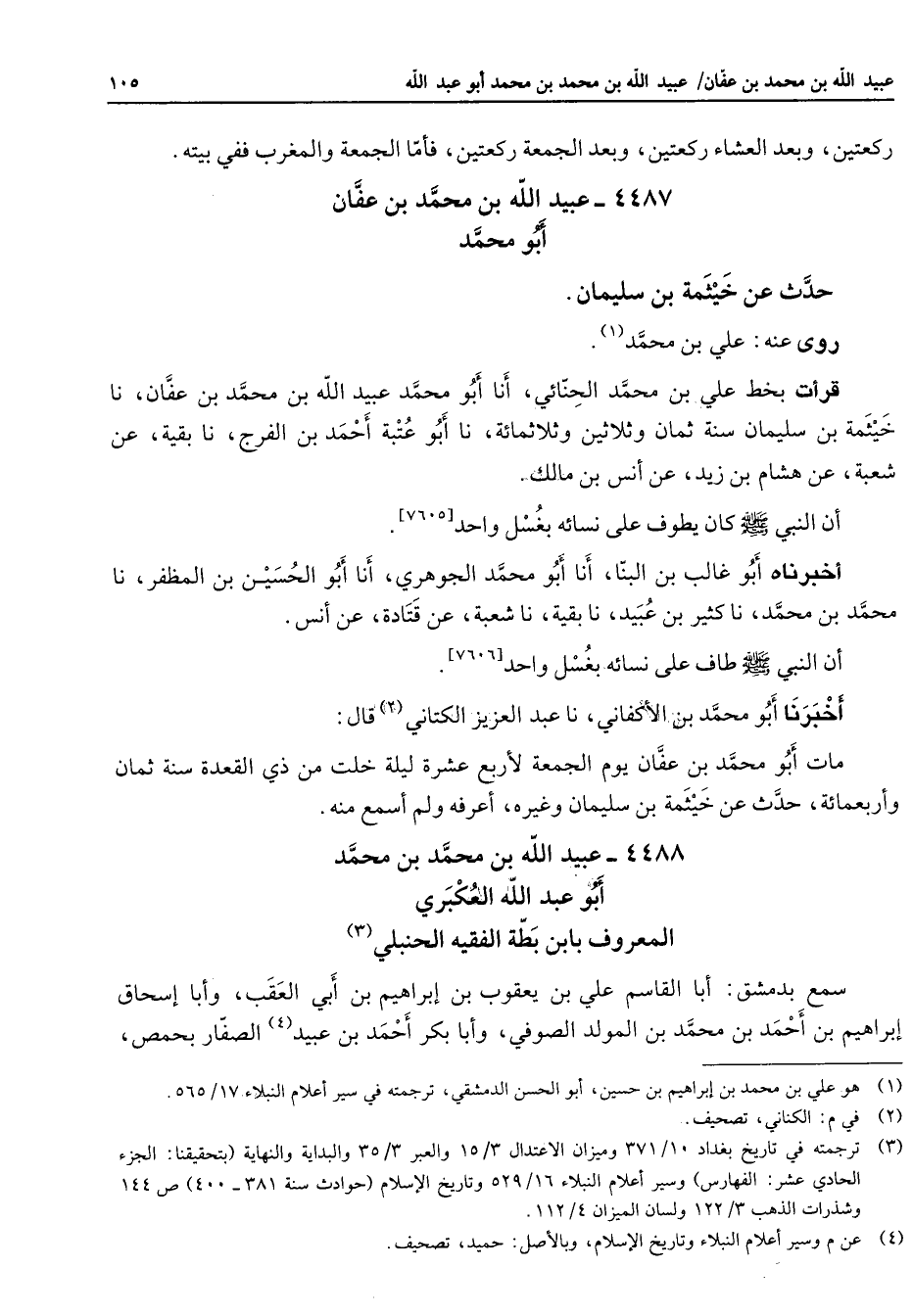 [7606] أخبرنا أبو محمد بن الأكفاني نا عبد العزيز الكتاني (2) قال مات أبو محمد بن عفان يوم الجمعة لأربع عشرة ليلة خلت من ذي القعدة سنة ثمان وأربعمائة حدث عن خيثمة بن سليمان وغيره أعرفه ولم أسمع منه 4488 - عبيد الله بن محمد بن محمد أبو عبد الله العكبري المعروف بابن بطة الفقه الحنبلي (3) سمع بدمشق أبا القاسم علي بن يعقوب بن إبراهيم بن أبي العقب وأبا إسحاق إبراهيم بن أحمد بن محمد بن المولد الصوفي وأبا بكر أحمد بن عبيد (4) الصفار بحمص