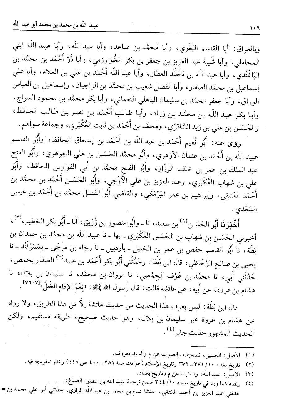 (4) ونصه كما ورد في تاريخ بغداد 10 / 344 ضمن ترجمة عبيد الله بن منصور الصباغ: حدثني عبد العزيز بن أحمد الكناني حدثنا تمام بن محمد بن عبد الله الرازي حدثني أبو علي محمد بن