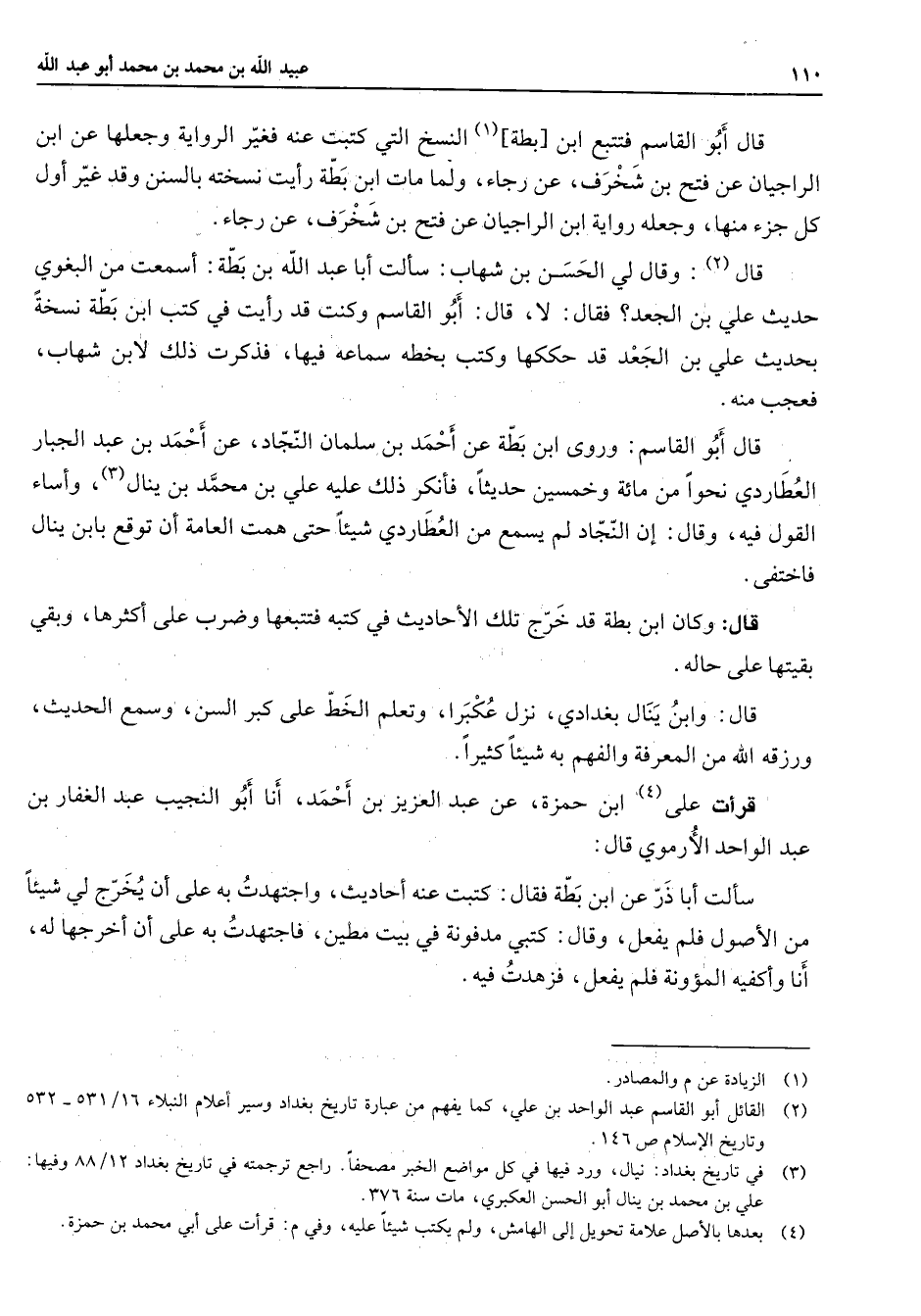 قال أبو القاسم فتتبع ابن بطة (1) النسخ التي كتبت عنه فغير الرواية وجعلها عن ابن لراجيان عن فتح بن شخرف عن رجاء ولما ما ت ابن بطة رأيت نسخته بالسنن وقد غير أول كل جزء منها وجعله رواية ابن الراجيان عن فتح بن شخرف عن رجاء قال (2) وقال لي الحسن بن شهاب سألت أبا عبد الله بن بطة أسمعت من البغوي حديث علي بن الجعد فقال لا قال أبو القاسم وكنت قد رأيت في كتب ابن بطة نسخة بحديث علي بن الجعد قد حككها وكتب بخطه سماعه فيها فذكرت ذلك لابن شهاب فعجب منه قال أبو القاسم وروى ابن بطة عن أحمد بن سلمان النجاد عن أحمد بن عبد الجبار العطاردي نحوا من مائة وخمسين حديثا فأنكر ذلك عليه علي بن محمد بن ينال (3) وأساء القول فيه وقال إن النجاد لم يسمع من العطاردي شيئا حتى همت العامة أن توقع بابن ينال فاختفى قال وكان ابن بطة قد خرج تلك الأحاديث في كتبه فتتبعها وضرب على أكثرها وبقي بقيتها على حاله قال وابن ينال بغدادي نزل عكبرا وتعلم الخط على كبر السن وسمع الحديث ورزقه الله من المعرفة والفهم به شيئا كثيرا قرأت على (4) ابن حمزة عن عبد العزيز بن أحمد أنا أبو النجيب عبد الغفار بن عبد الواحد الأرموي قال سألت أبا ذر عن ابن بطة فقال كتبت عنه أحاديث واجتهدت به على أن يخرج لي شيئا من الأصول فلم يفعل وقال كتبي مدفونة في بيت مطين فاجتهدت به على أن أخرجها له أنا وأكفيه المؤونة فلم يفعل فزهدت فيه