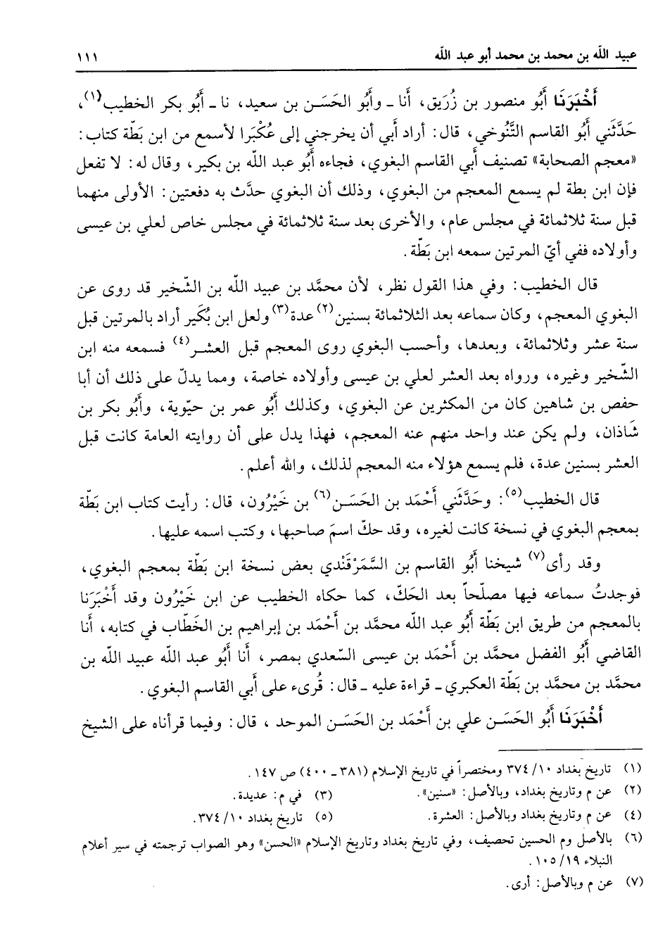 أخبرنا أبو منصور بن زريق أنا وأبو الحسن بن سعيد نا أبو بكر الخطيب (1) حدثني أبو القاسم التنوخي قال أراد أبي أن يخرجني إلى عكبرا لأسمع من ابن بطة كتاب معجم الصحابة تصنيف أبي القاسم البغوي فجاءه أبو عبد الله بن بكير وقال له لا تفعل فإن ابن بطة لم يسمع المعجم من البغوي وذلك أن البغوي حدث به دفعتين الأولى منهما قبل سنة ثلاثمائة في مجلس عام والآخري بعد سنة ثلاثمائة في مجلس خاص لعلي بن عيسى وأولاده ففي أي المرتين سمعه ابن بطة قال الخطيب وفي هذا القول نظر لأن محمد بن عبيد الله بن الشخير قد روى عن البغوي المعجم وكان سماعه بعد الثلاثمائة بسنين (2) عدة (3) ولعل ابن بكير أراد بالمرتين قبل سنة عشر وثلاثمائة وبعدها وأحسب البغوي روى المعجم قبل العشر (4) فسمعه منه ابن الشخير وغيره ورواه بعد العشر لعلي بن عيسى وأولاده خاصة ومما يدل على ذلك أن أبا حفص بن شاهين كان من المكثرين عن البغوي وكذلك أبو عمرو بن حيوية وأبو بكر بن شاذان ولم يكن عند واحد منهم عنه المعجم فهذا يدل على أن روايته العامة كانت قبل العشر بسنين عدة فلم يسمع هؤلاء منه المعجم لذلك والله أعلم قال الخطيب (5) وحدثني أحمد بن الحسن (6) بن خيرون قال رأيت كتاب ابن بطة بمعجم البغوي في نسخة كانت لغيره وقد حك اسم صاحبها وكتب اسمه عليها وقد رأى (7) شيخنا أبو القاسم بن السمرقندي بعض نسخة ابن بطة بمعجم البغوي فوجدت سماعه فيها مصلحا بعد الحك كما حكاه الخطيب عن ابن خيرون وقد أخبرنا بالمعجم من طريق ابن بطة أبو عبد الله محمد بن أحمد بن إبراهيم بن الخطاب في كتابه أنا القاضي أبو الفضل محمد بن أحمد بن عيسى السعدي بمصر أنا أبو عبد الله عبيد الله بن محمد بن محمد بن بطة العكبري قراءة عليه قال قرئ على أبي القاسم البغوي أخبرنا أبو الحسن علي بن أحمد بن الحسن الموحد قال وفيما قرأناه على الشيخ