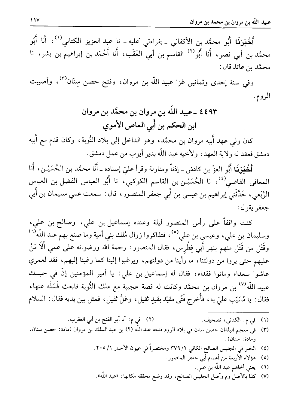 أخبرنا أبو محمد بن الأكفاني بقراءتي عليه نا عبد العزيز الكتاني (1) أنا أبو محمد بن أبي نصر أنا أبو (2) القاسم بن أبي العقب أنا أحمد بن إبراهيم بن بشر نا محمد بن عائذ قال وفي سنة إحدى وثمانين غزا عبيد الله بن مروان وفتح حصن سنان (3) وأصيبت الروم 4493 - عبيد الله بن مروان بن محمد بن مروان ابن الحكم بن أبي العاص الأموي كان ولي عهد أبيه مروان بن محمد وهو الداخل إلى بلاد النوبة وكان قدم مع أبيه دمشق فعقد له ولاية العهد ولأخيه عبد الله بدير أيوب من عمل دمشق أخبرنا أبو العز بن كادش إذنا ومناولة وقرأ علي إسناده أنا محمد بن الحسين أنا المعافى القاضي (4) نا الحسين بن القاسم الكوكبي نا أبو العباس الفضل بن العباس الربعي حدثني إبراهيم بن عيسى بن أبي جعفر المنصور قال سمعت عمي سليمان بن أبي جعفر يقول كنت واقفا على رأس المنصور ليلة وعنده إسماعيل بن علي وصالح بن علي وسليمان بن علي وعيسى بن علي (5) فتذاكروا زوال ملك بني أمية وما صنع بهم عبد الله (6) وقتل من قتل منهم بنهر أبي فطرس فقال المنصور رحمة الله ورضوانه على عمي ألا من عليهم حتى يروا من دولتنا ما رأينا من دولتهم ويرغبوا إلينا كما رغبنا إليهم فقد لعمري عاشوا سعداء وماتوا فقداء فقال له إسماعيل بن علي يا أمير المؤمنين إن في حبسك عبيد الله (7) بن مروان بن محمد وكانت له قصة عجيبة مع ملك النوبة فابعث فسله عنها فقال يا مسيب علي به فأخرج فتى مقيد بقيد ثقيل وغل ثقيل فمثل بين يديه فقال السلام